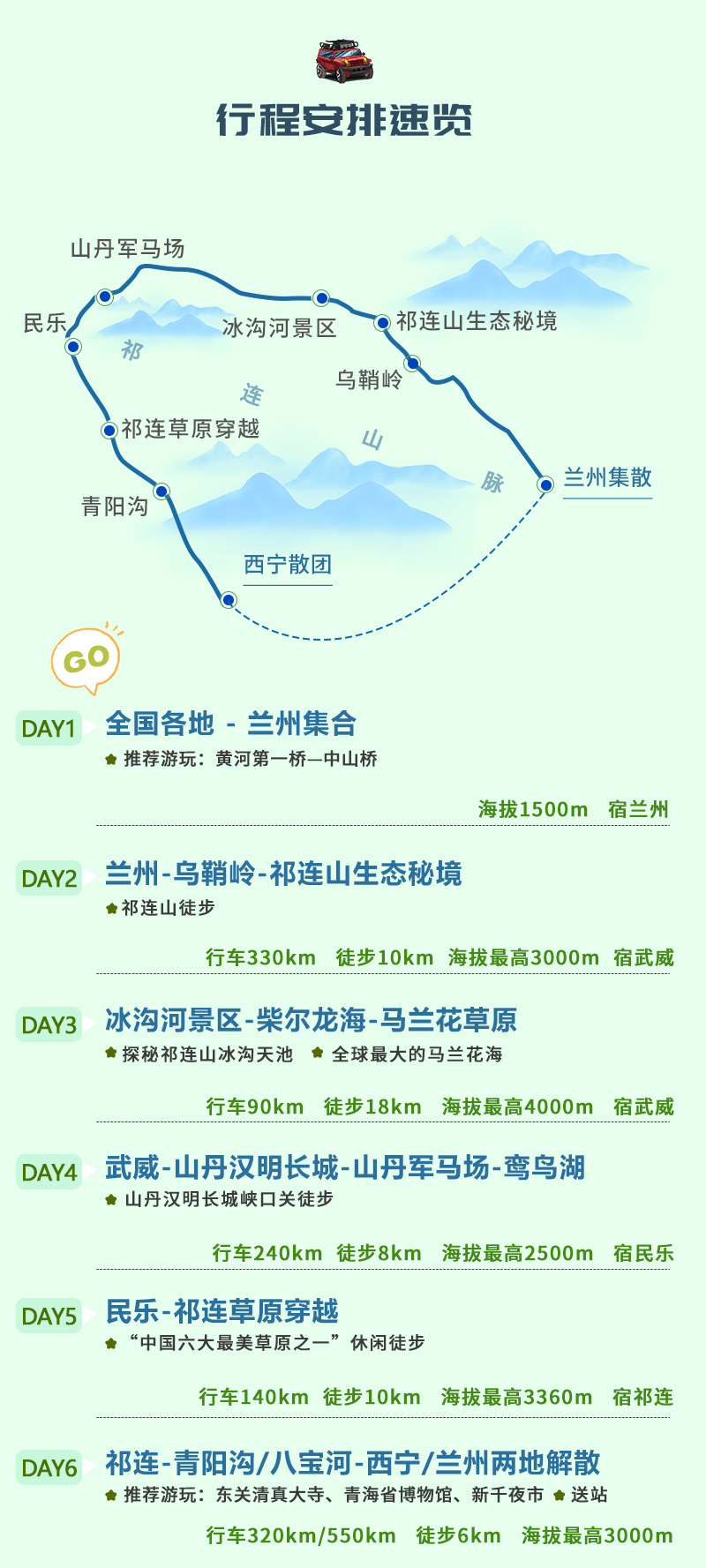 海拔:徒步最高海拔3360m,祁连县2780m。