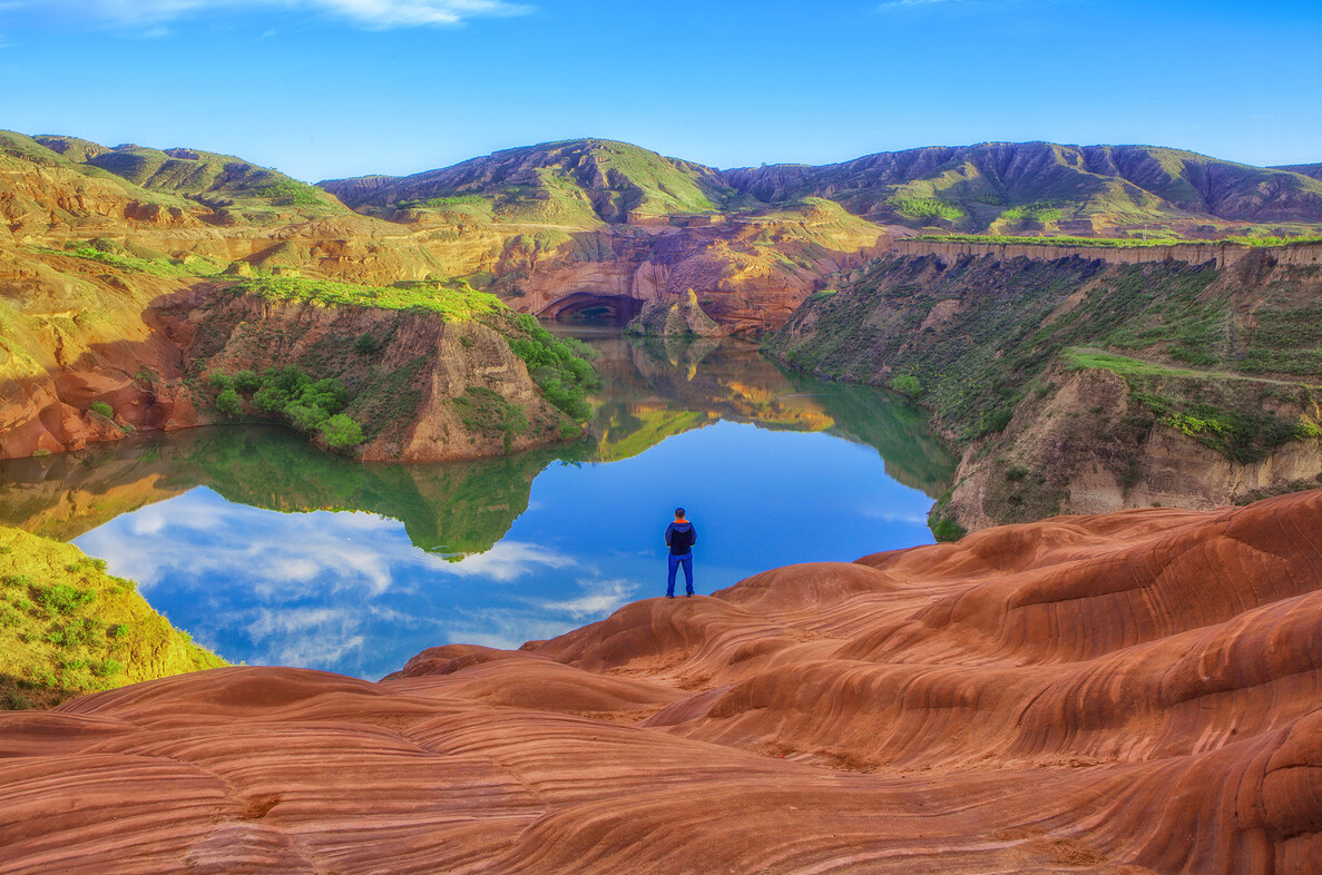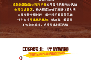 适时离开,前往榆林靖边的【波浪谷】,这里和美国亚利桑那州波浪谷齐名,处于同一纬度,虽然规模没那么大,但壮观的景象一点都不亚于美国波浪谷。靖边波浪谷目前仍处于半开发状态,景色比较原生态,红色砂岩历经风雨剥蚀呈现出千奇百怪的姿态和色彩,不同角度、时间都会呈现不同的景色,尤其是下一场小雨,被雨水浸润的红砂岩看上去更加细腻和五彩缤纷,美的更加富有层次,视觉冲击超强,是摄影大咖们的最爱。傍晚时分,我们去往波浪谷景区最值得称奇的【水上丹霞】【未开发区域交通费自理】,感受夕阳、红砂岩、碧水与蓝天的交相辉映,这种别样的美,会让你惊叹在黄土高坡上竟有如此温柔的景致,仿佛塞上江南。此刻我们可以跟着陕北老乡,哼一曲悠扬的信天游,将自己深深融入此情此景之中。