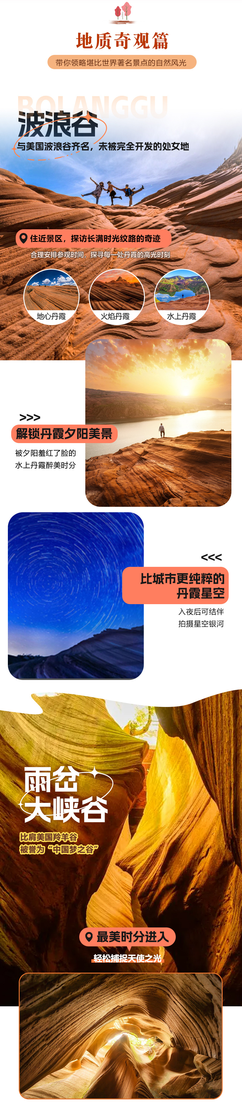 早餐后,我们来到【波浪谷】景区的1,2号景点,今天的重头戏是地心丹霞和火焰丹霞。火焰丹霞正如其名,以颜色著称,这里你可以拍到色彩浓烈,纹路清晰的红褐色丹霞,也可以用无人机飞上天空,感叹大地掌纹的神奇之处。随后经过赤壁丹霞,雄伟壮观的炎炎赤壁,山下绿草盈盈,流沙河穿梭其间,两种截然不同观感给人带来强烈的视觉冲击,对比之下有种奇异的美感,最后穿越时空隧道,通往地心丹霞,这里犹如盘古开天辟地的一把斧头将丹霞劈开,我们可以沿着栈道,一路欣赏天然形成的绝美纹路、打卡一线天,触摸时光掌纹,直达地平面。