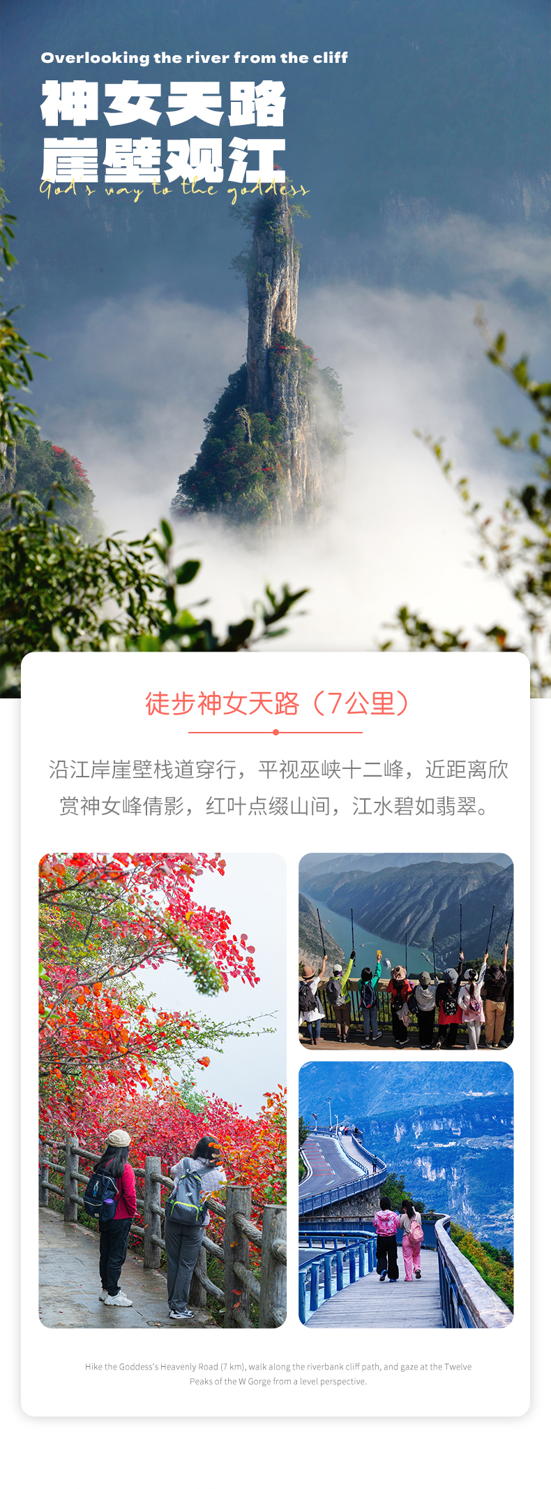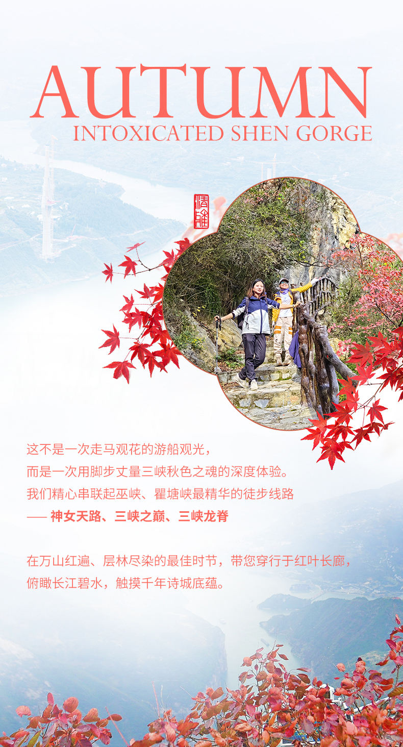 我们将乘车前往巫山神女天路,走一段风景绝佳的红叶路线,在如火如荼的红叶里穿梭,近距离接触红叶。一路穿越巫峡,欣赏“曾经沧海难为水,除却巫山不是云”的壮观景象,一路红叶相伴,美不胜收,这里也被驴友评为长江上最美的三峡画廊。