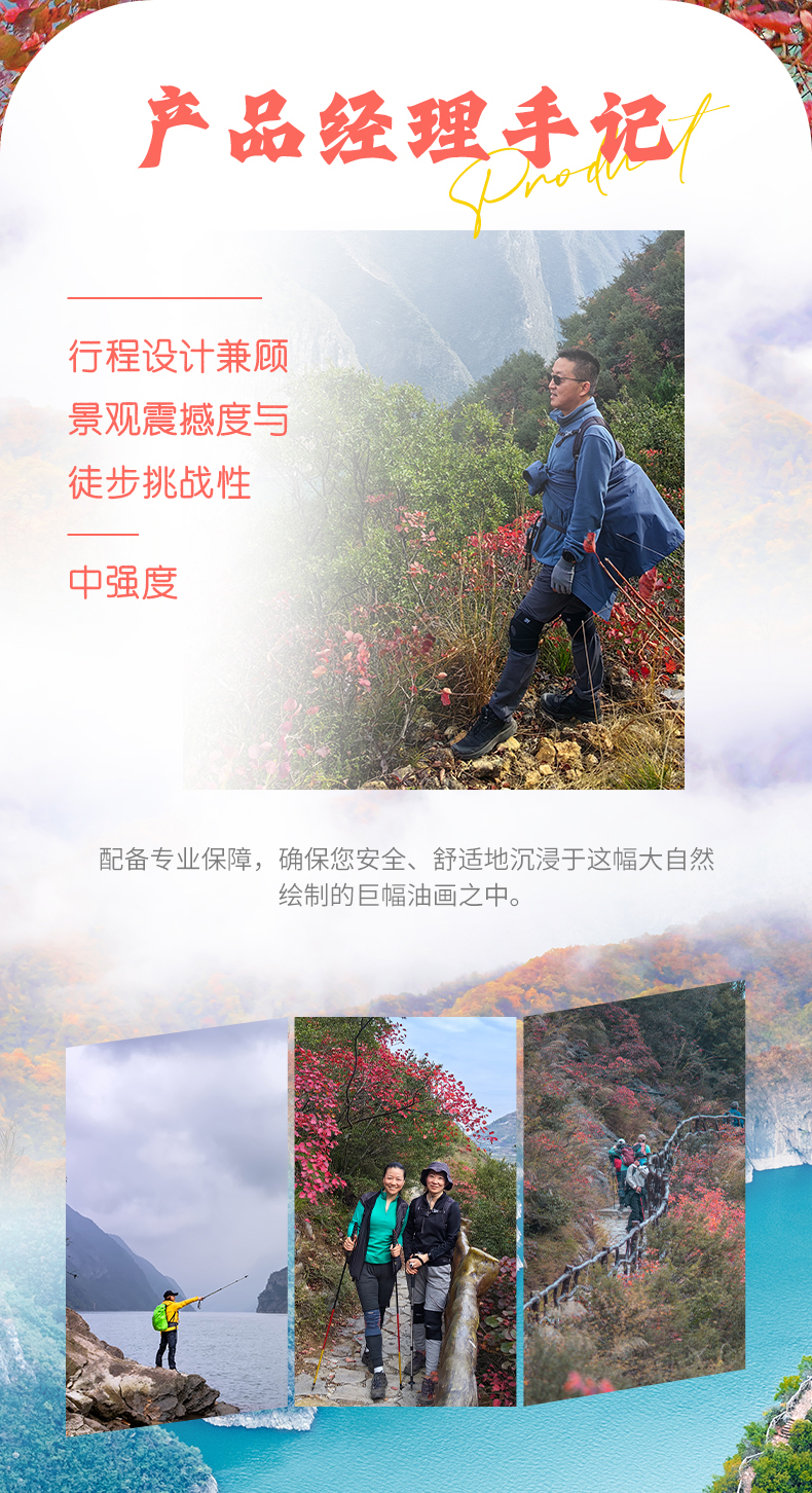 3. 本产品属于秋季产品,秋景确定时间不确定的,正常是11月份秋景,但是也有提前或延后情况,游玩时请合理对待实际景色;