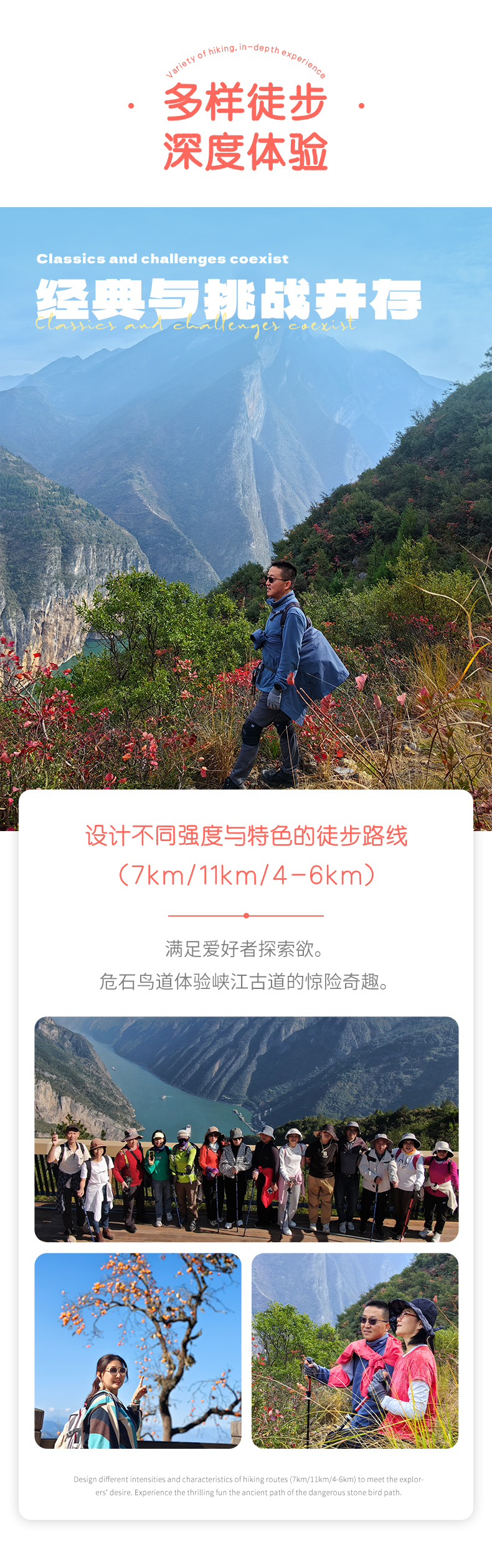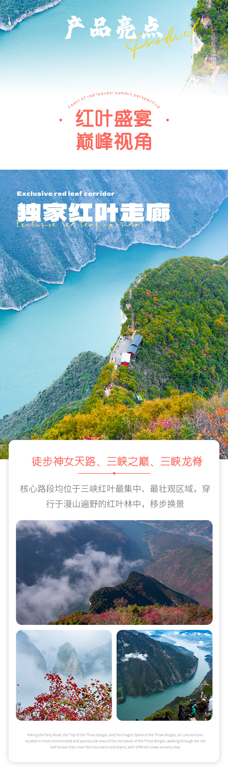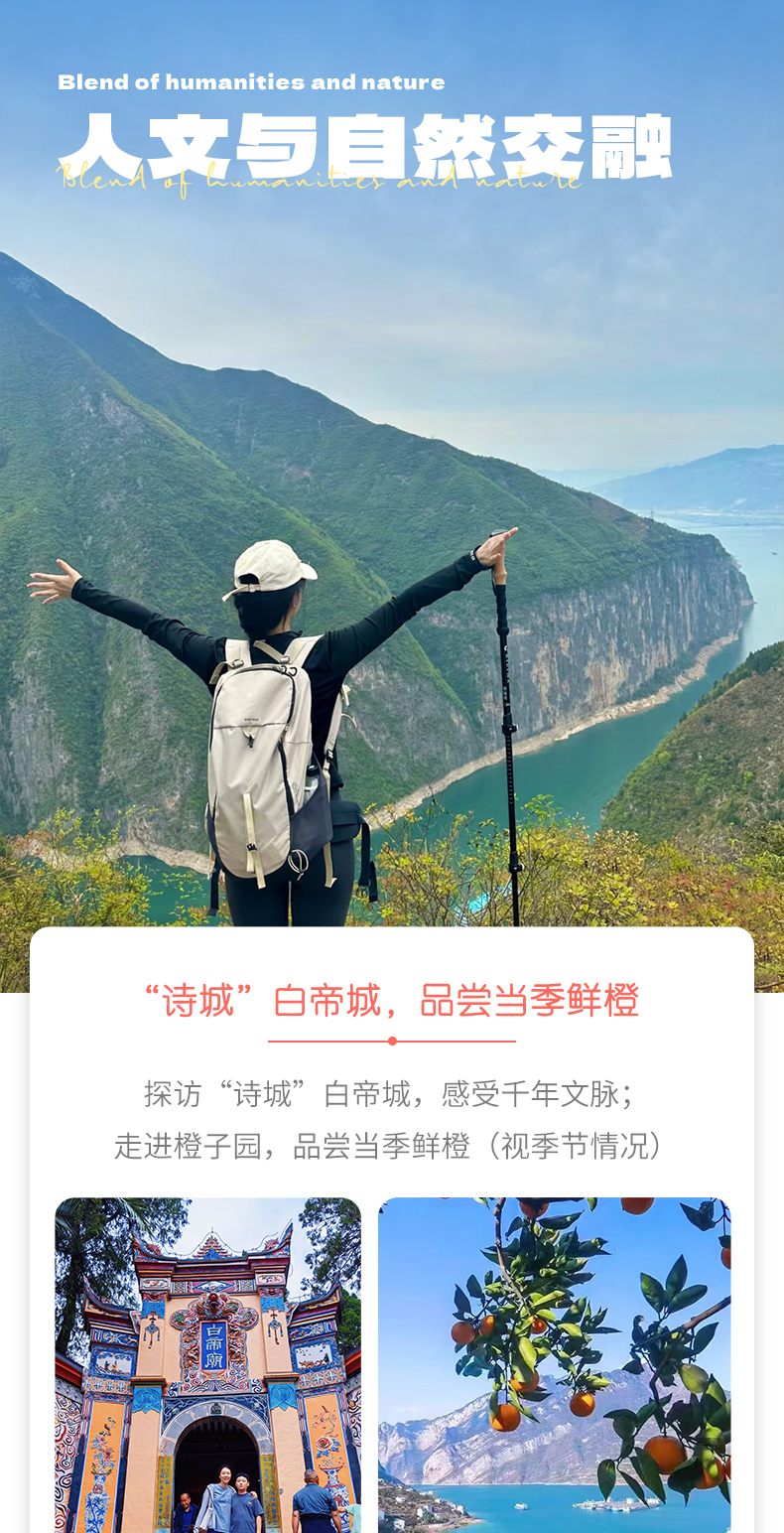 之后,我们沿着栈道,徒步上到三峡之巅,一路沿着危石鸟道、诗意栈道、天音神道上行,沿着山脊、丛林、九十九拐穿行,单程约11-12公里,以景区栈道、石板路为主,可谓一步一景,一路领略长江的壮美、红叶的浪漫。中途也会经过橙子园,我们可以休息,品尝橙子。