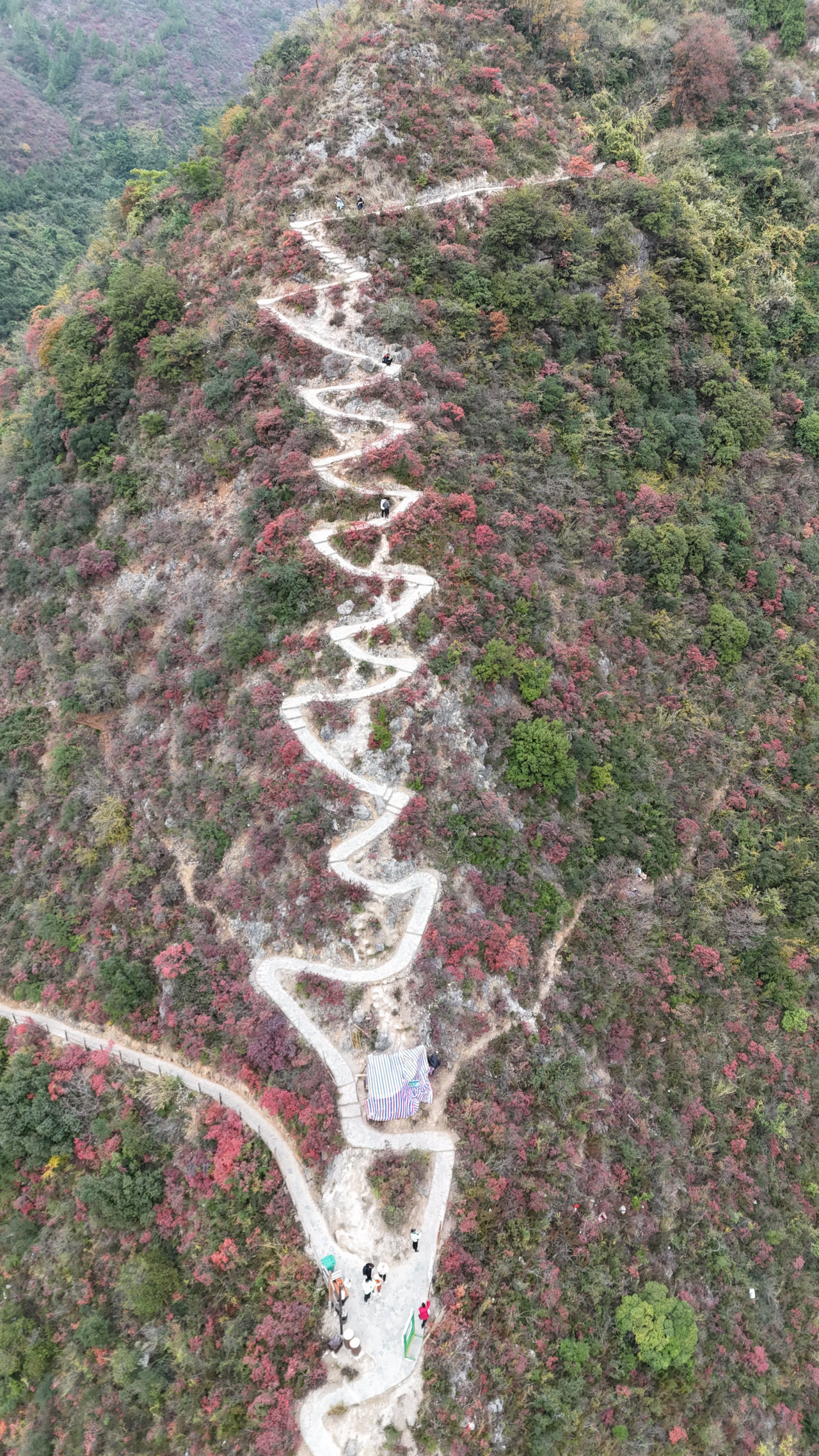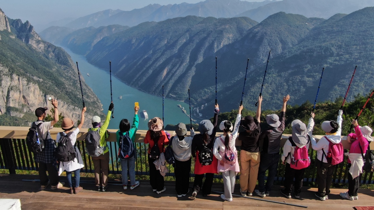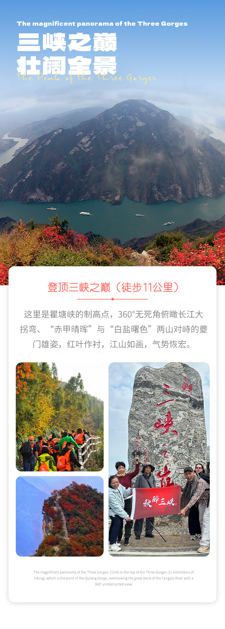 大概徒步11公里,后站在三峡之巅俯瞰长江的壮美和那满山的红叶,眼前是一望无际的山峦、瞿塘峡,连绵起伏,被红叶装点得如诗如画。