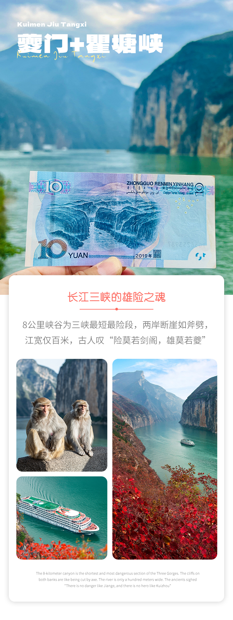 在白帝城,在白帝城,感受一下古诗词的文化魅力。并且还可以了解白帝城托孤的典故,以及喂一喂“两岸猿声啼不住”的后代。最后打卡10元人民币背景——夔门。