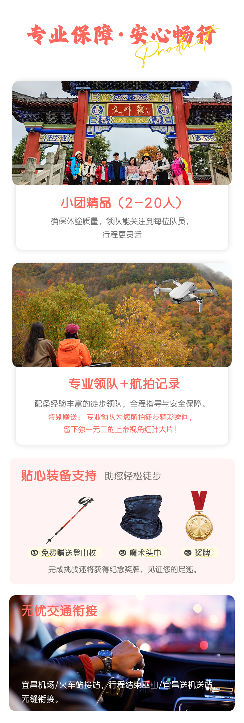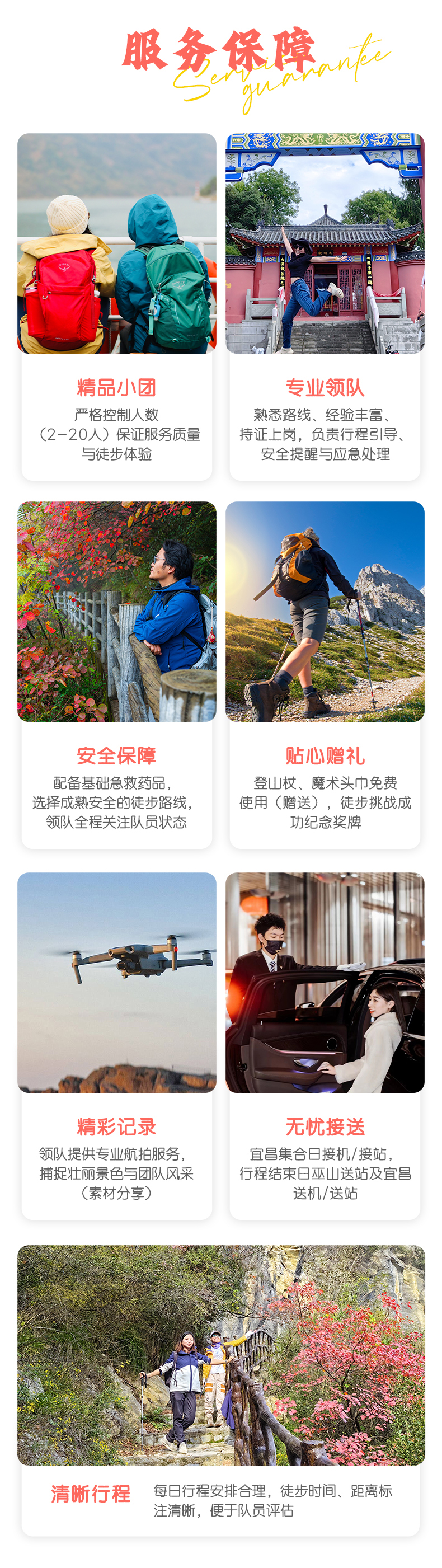 答:我们路程大部分是景区栈道,神女天路是成成熟的路线,都比较好走。并且我们摒弃了长时间无畏的徒步,将徒步路程缩短了,让大家更多地游玩;