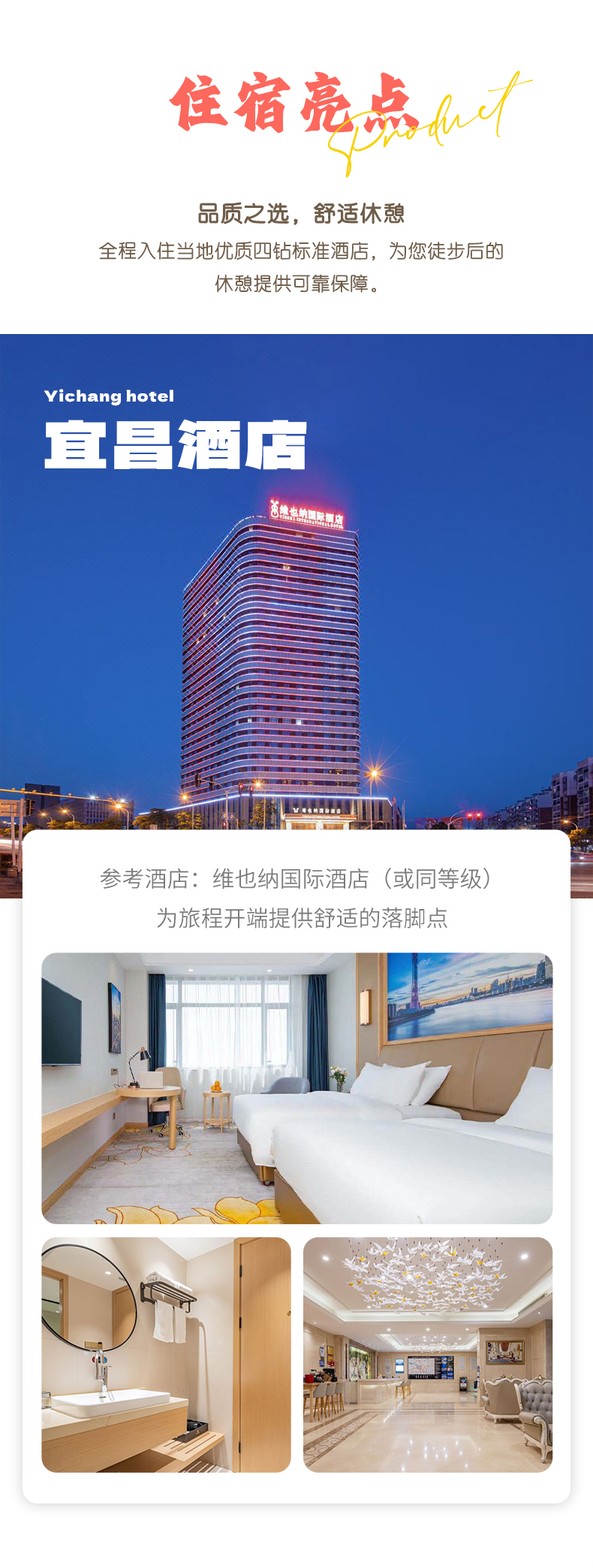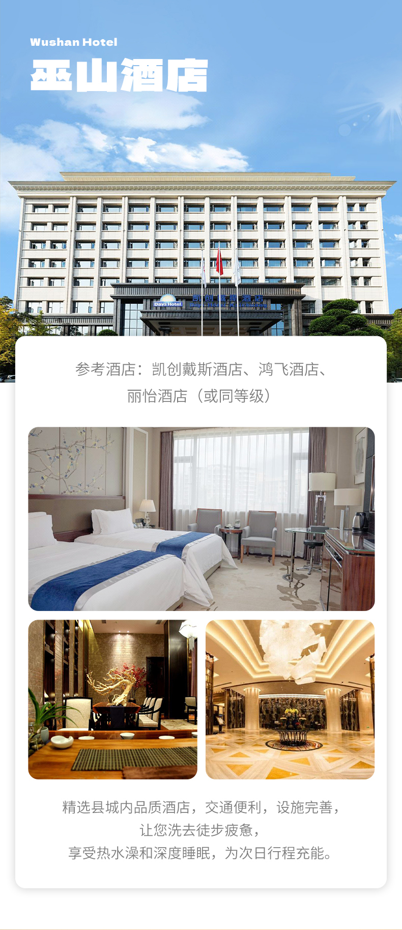2. 住宿:宜昌四钻酒店住宿1晚(参考维也纳国际酒店、丽枫酒店等)、巫山四钻酒店住宿2晚(参考凯创戴斯酒店、鸿飞酒店等);