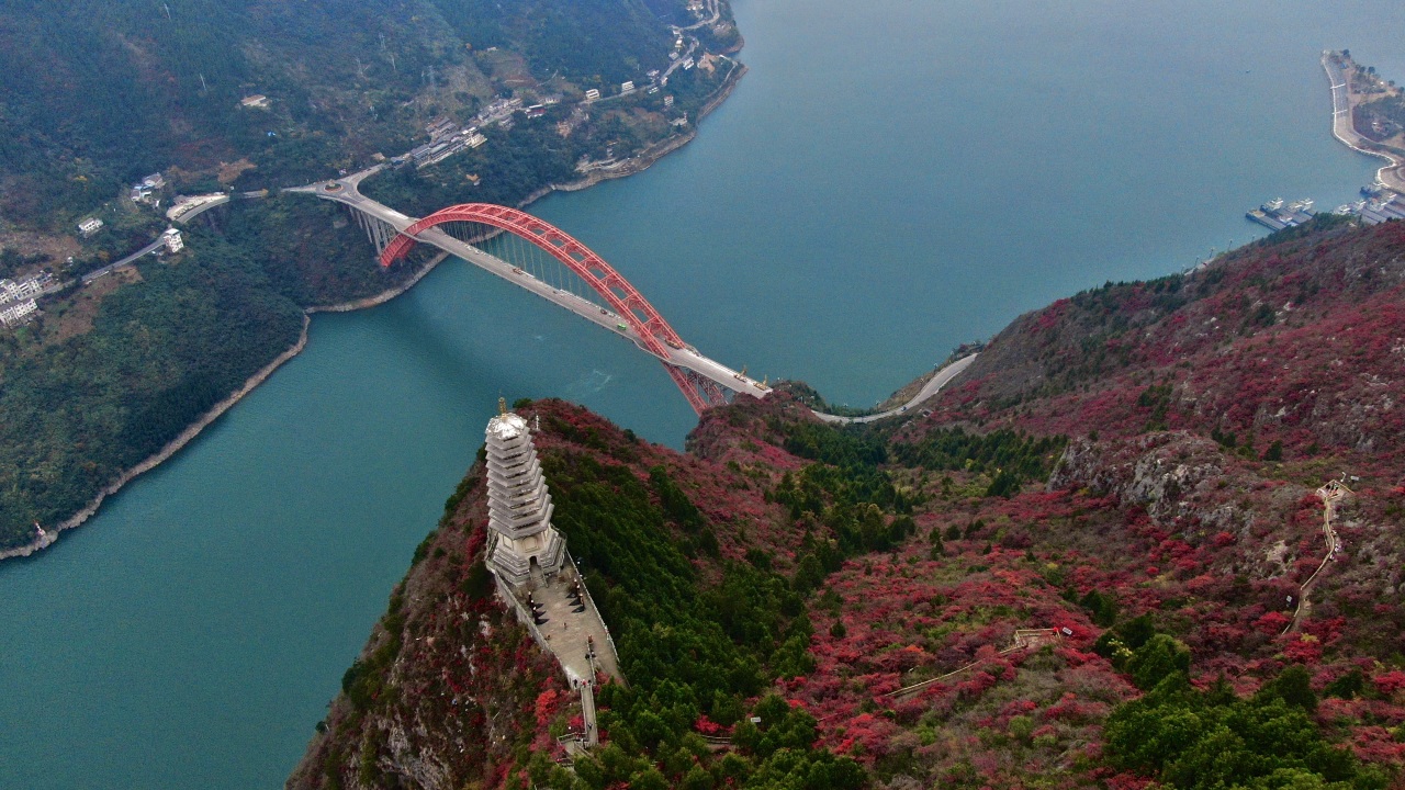 站在文峰观山顶远眺,红叶遍山峦,长江如带、柔润绵长,一江碧水与江山红叶交相辉映,蔚为壮观。透过似火的红叶,俯瞰巫峡口彩虹卧波,“一桥飞架南北,天堑变通途”。远眺巫山县城依山层叠,江与城风情如画,让人顿生江山豪情。