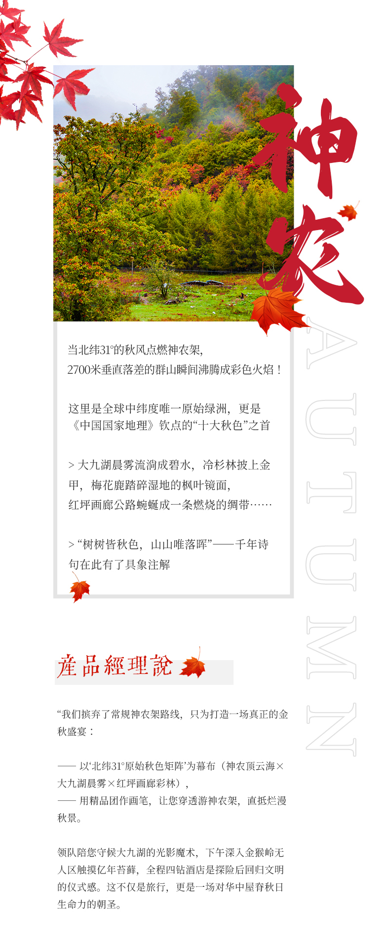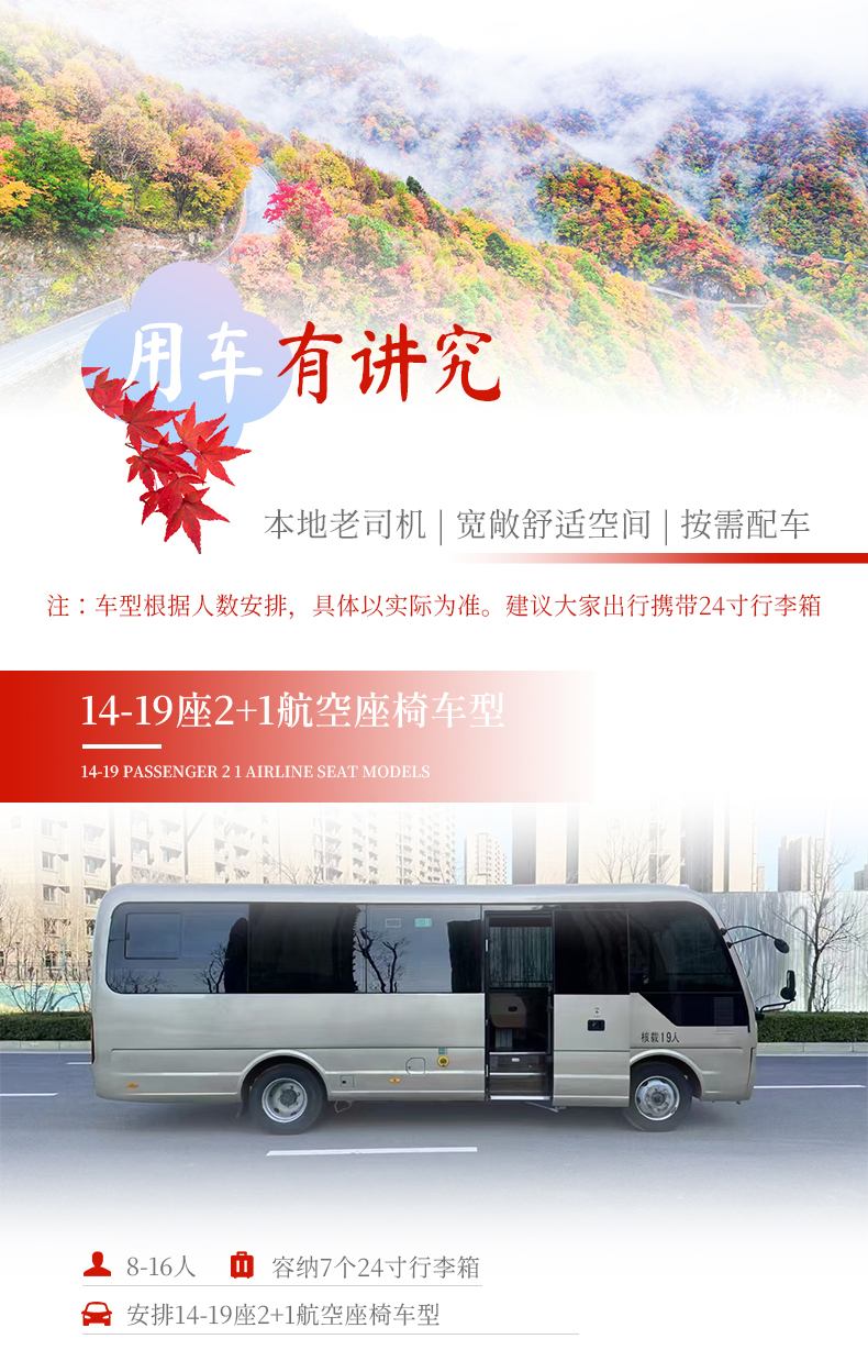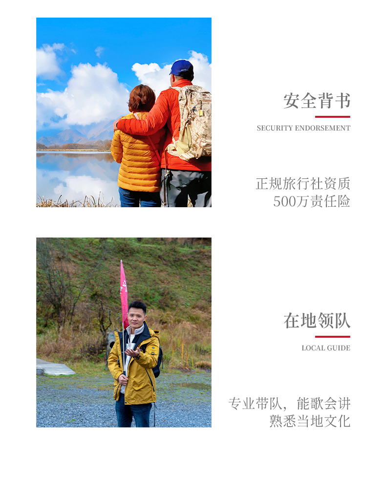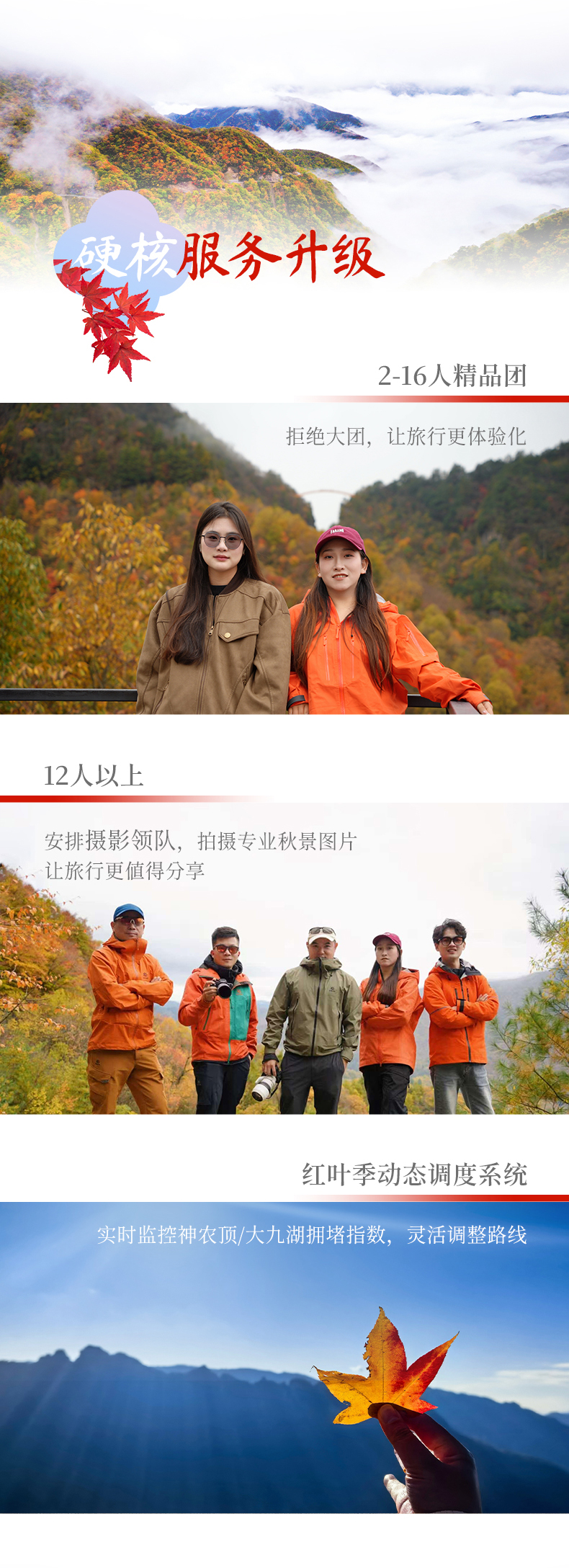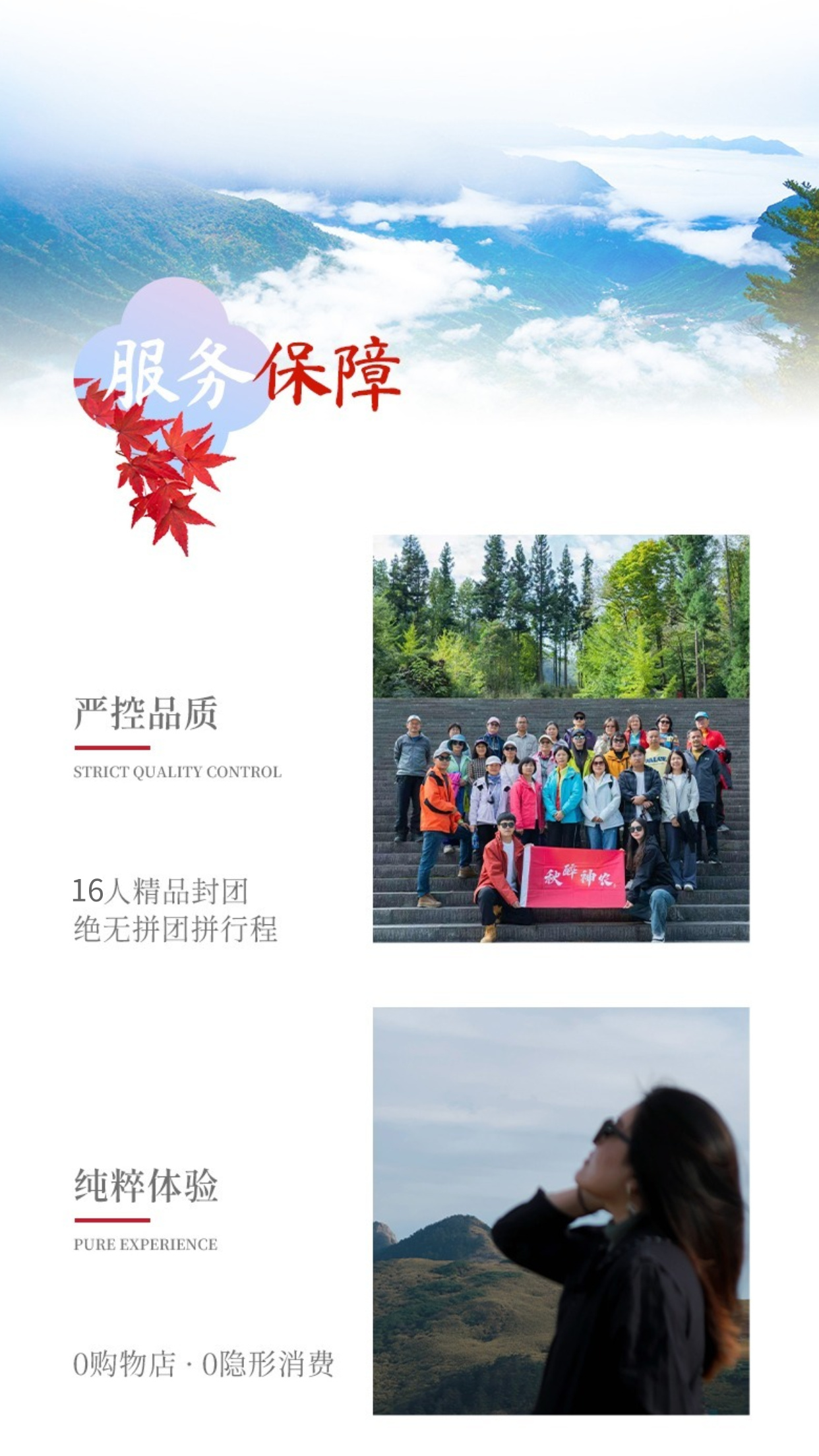 3. 本产品属于秋季产品,秋景确定时间不确定的,正常是10月份秋景,但是也有提前或延后情况,游玩时请合理对待实际景色;