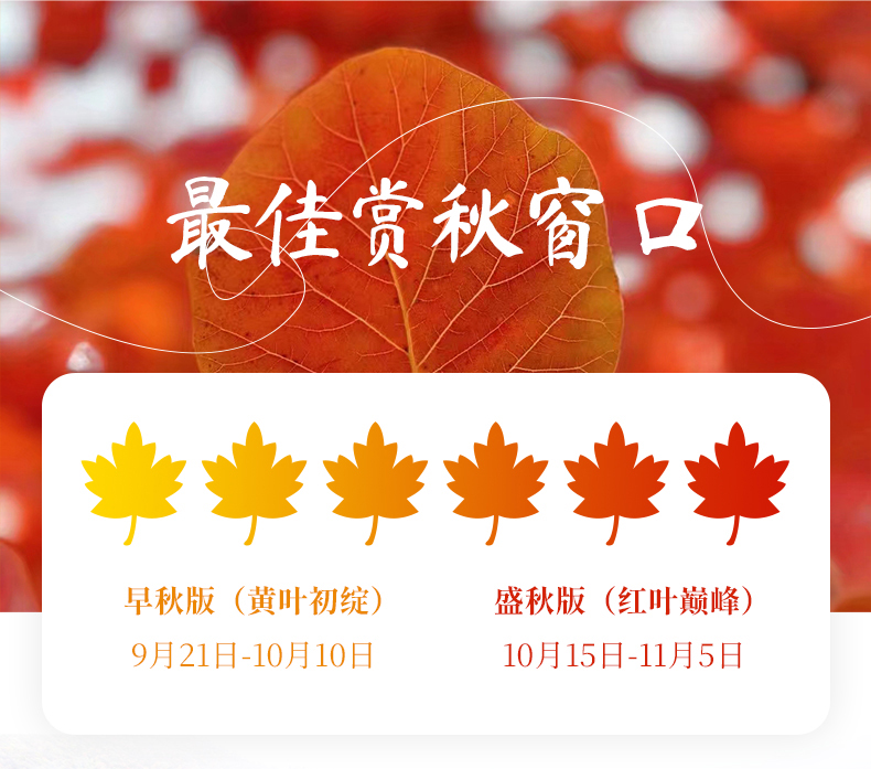 7. 本产品属于秋季产品,秋景确定时间不确定的,正常是10月份秋景,但是也有提前或延后情况,游玩时请合理对待实际景色;一般10月中下旬最好;