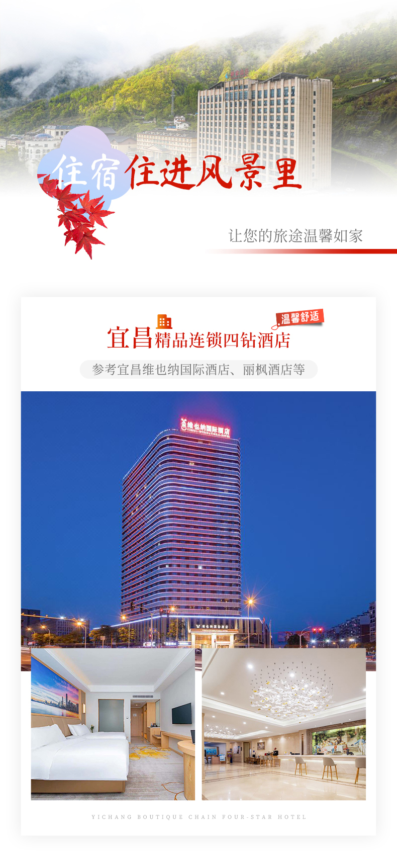 2. 住宿:木鱼镇四钻酒店住宿1晚、宜昌四钻酒店住宿1晚、坪阡古镇准四酒店住宿1晚;