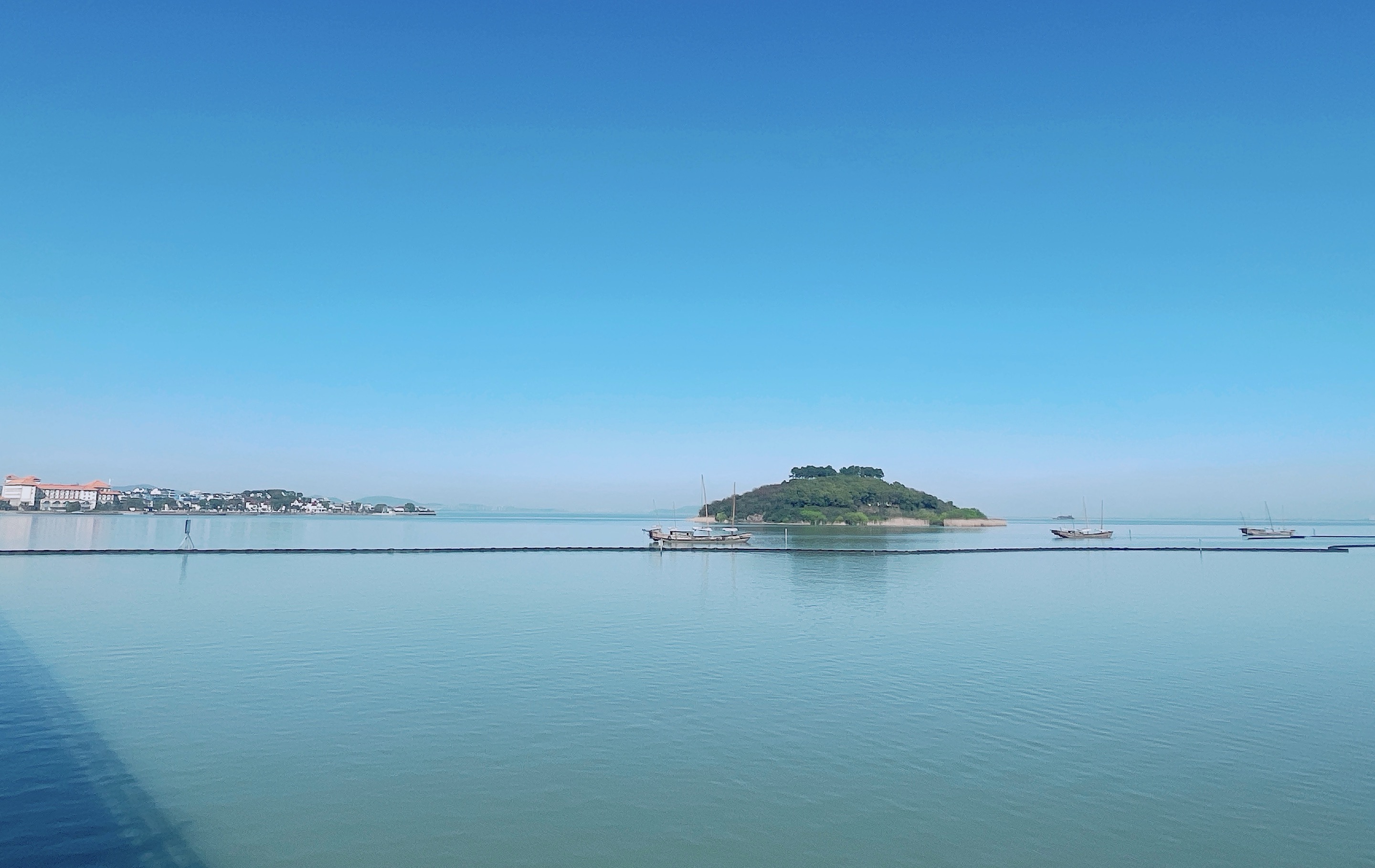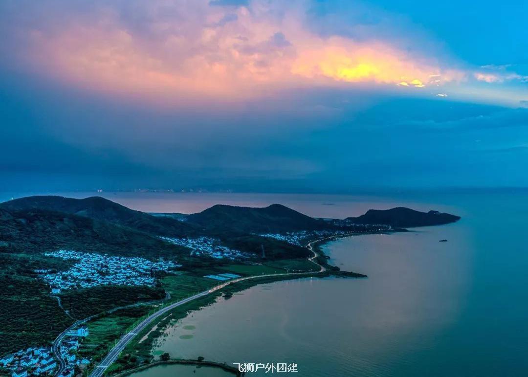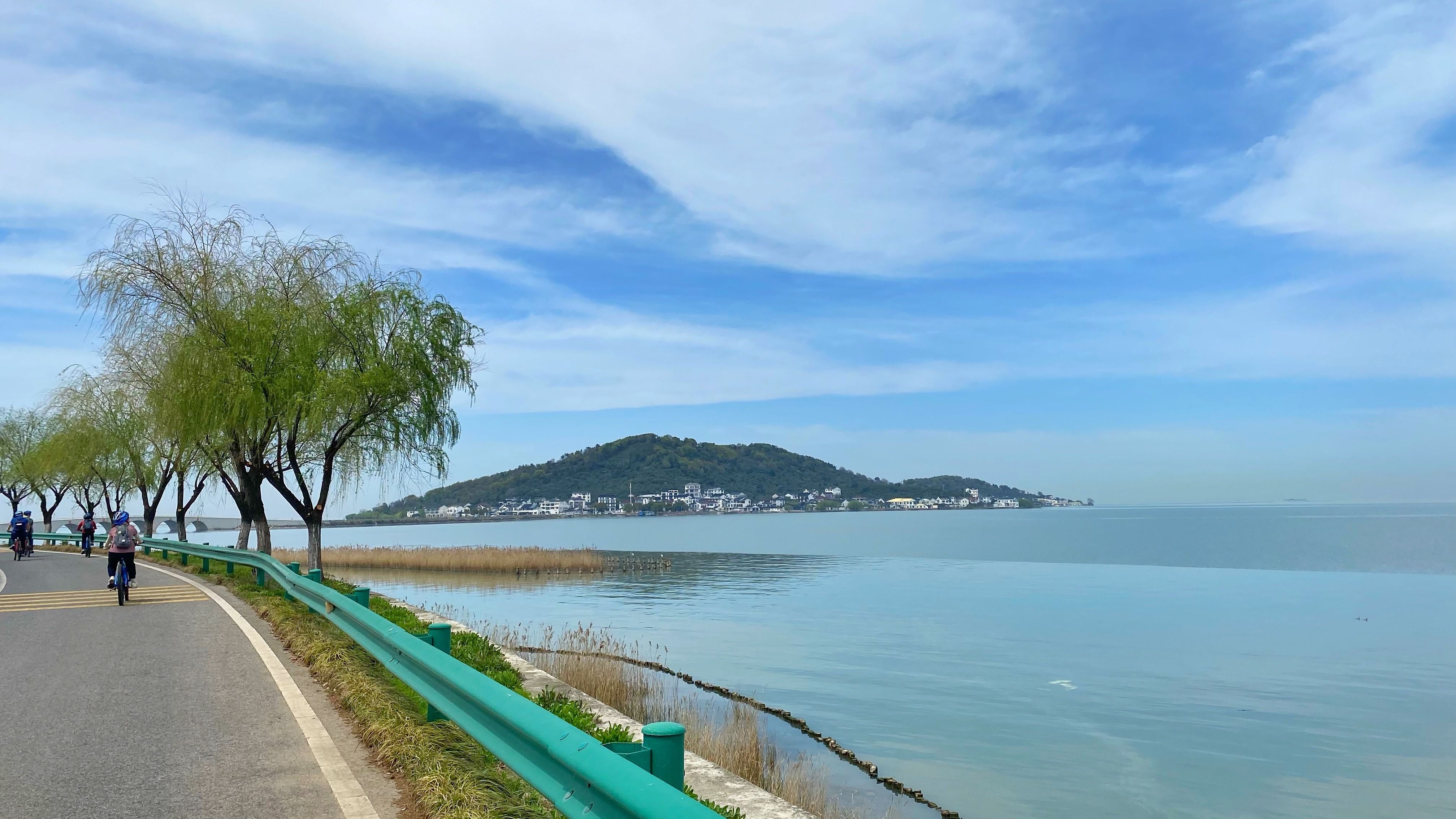 下午骑到【明月湾古村】,《何以笙箫默》曾在此取景,我们在此稍适休息,在网红码头静静欣赏烟波浩渺的太湖,听一听旁边的蝉鸣鸟叫声。我们骑过古村和果林,在【太湖大桥】上等一场令人心醉的日落,完成我们的环岛骑行