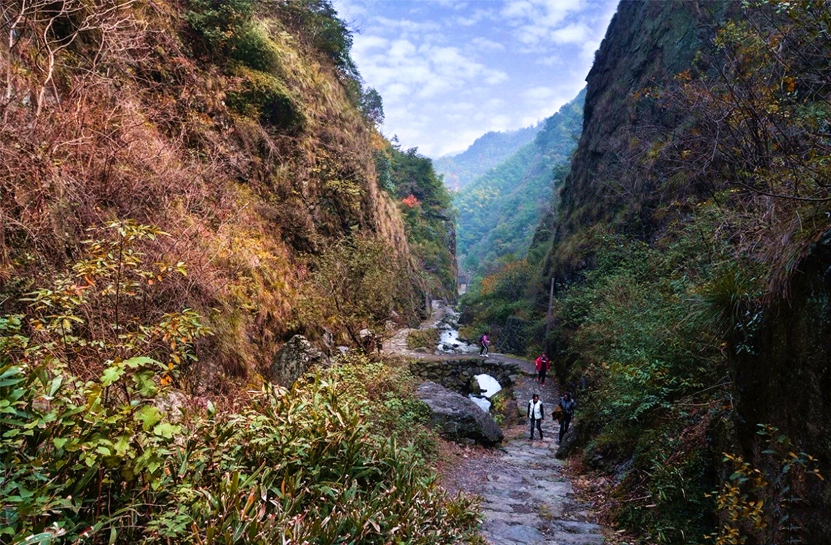 雪窦岭坐落在稽东镇镇东南,富有原始的自然野趣,过去是从稽东去龙峰的必翻之岭。于是古人沿着溪流筑了一条山路,山路全长3公里左右,至今保存完好。据地质专家说,雪窦岭原是火山口,火山爆发时岩浆形成的沟就是现在的溪涧。溪涧夹在两山之间,终年少有阳光,溪水特别清冷,是酷暑期间避暑的好地方。雪窦岭峰、嶂、涧、瀑与古道融为一体,体现了古、雅、幽、奇、险五大特色。我们走进止步坑村,走上雪窦岭,去探寻这隐世的美景。
