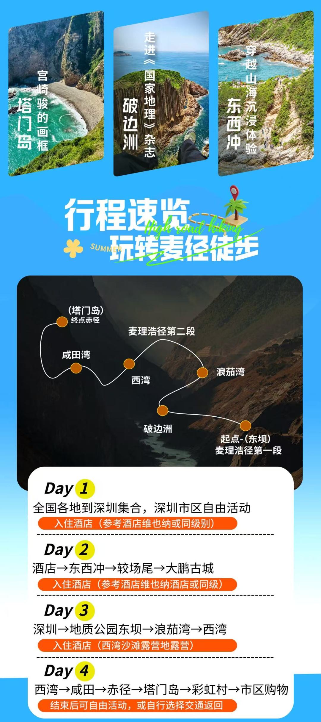 早餐后出发,前往被《国家地理杂志》评为最美的十大海岸线之一的东西冲徒步起点【东涌码头】,这是一条将山海、礁石与自然完美结合的穿越路线。一半山路,一半海岸线。全程徒步景观都值得停下脚步来欣赏、拍照感受,给你无敌海景。