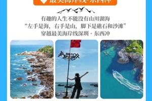 下午沿海岸线攀越山崖、踏过礁石,向西冲挺进,途中有红旗标志打卡点,到达天文台网红悬崖栈道上,在高点俯瞰这开阔的海岸线。随后跟着领队下山到达【西涌沙滩】结束这段徒步,后集体乘车前往较场尾入住海滨酒店。