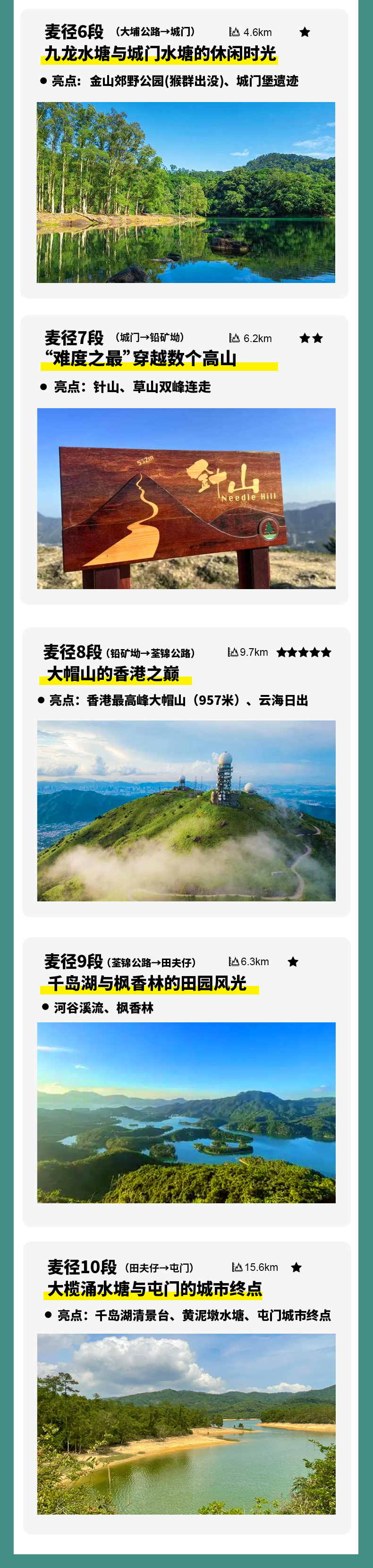 第九段是麦径的田园诗篇,主要是林间风光为主。该段难度较低,基本全程公路,从荃锦公路出发,千岛湖观景台是爆款打卡点,去到田夫仔露营场玮重点,沿途的田园风光让人放松。该段终点田夫仔为官方营地,有士多店。
