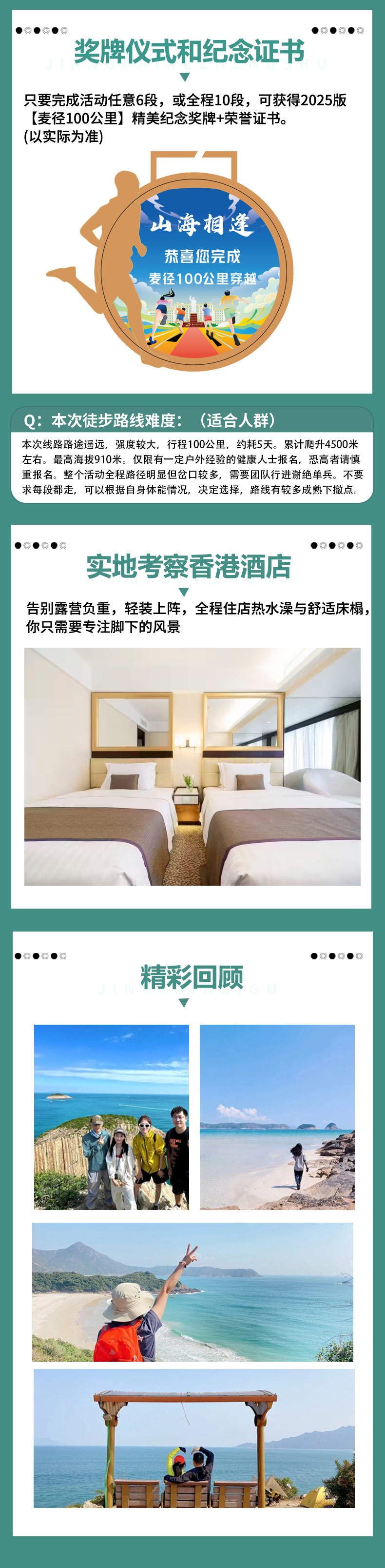约下午四点徒步结束。完成愉快的麦径穿越之旅,颁发奖牌和纪念证书。我们活动在香港市区解散,大家可自由安排时间或继续游玩或跟随领队一起过关,乘坐地铁前往深圳入关口岸,回到深圳后坐地铁前往高铁站,返回温馨的家。