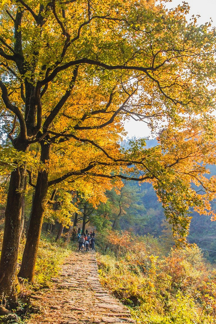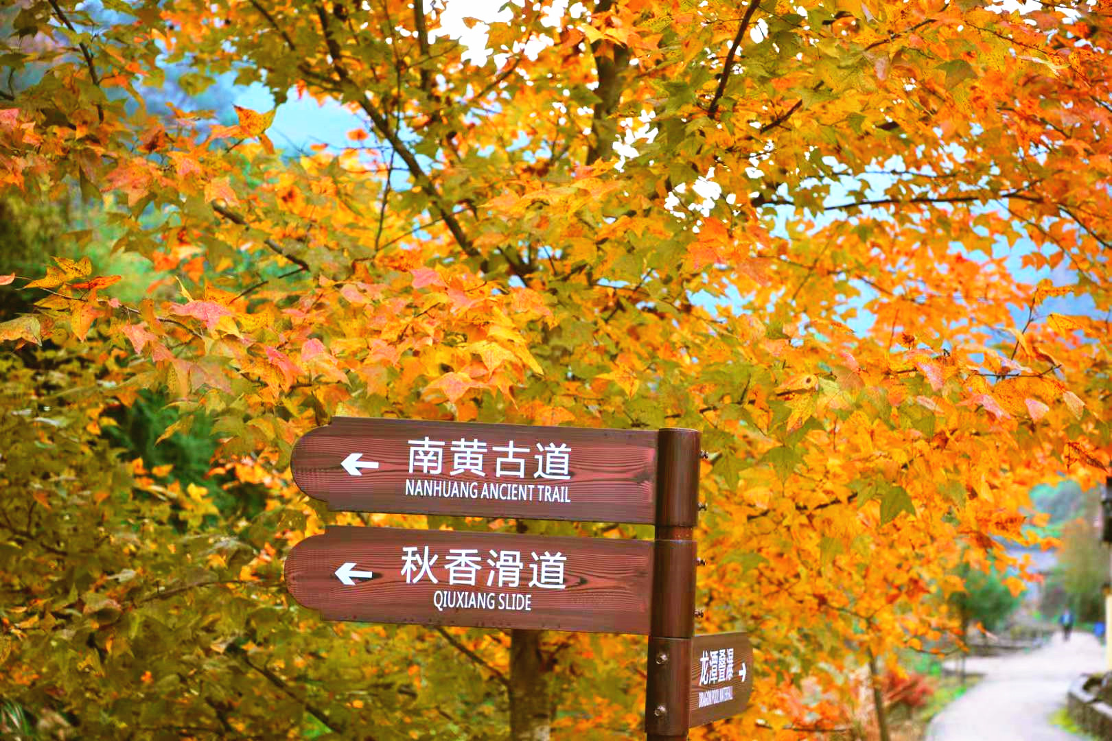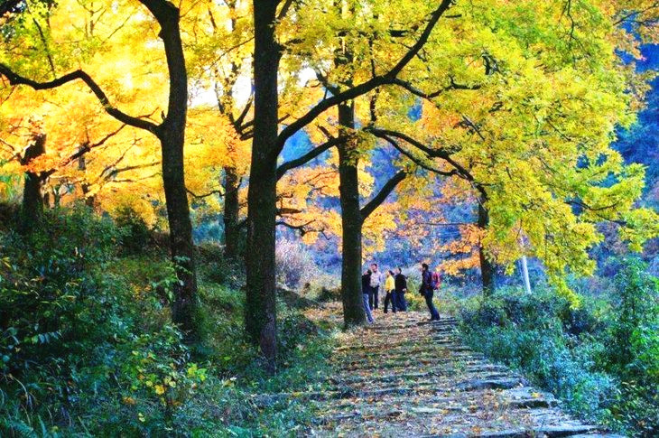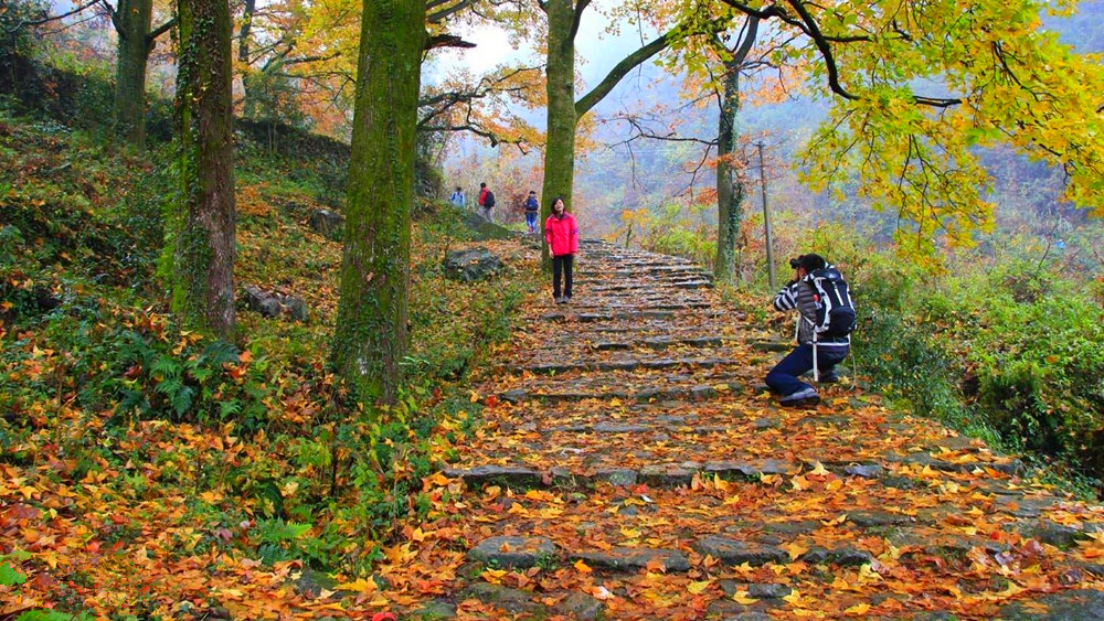 是天台和临海古时的通商要道,虽然没有徽杭古道那样的有名,但其一边是沧桑古道,高大枫树罗列两边,仿佛油画一般;另一边是无穷无尽的梯田,夹杂着古老梯田;春天花开,梯田放水的时候,尤其漂亮。此线路强度难度不大,适合所有年龄层。“北有香山红叶,南有南黄古道”,由于受网友、驴友的热捧,南黄古道被大家列为全国八大赏枫基地之一。在古时,南黄古道的美景被称为“南山秋色”。为乾隆御赐的“天台八景 ”之一。南屏乡位于天台县南边,传统上称为南山。南山多野生红枫与乌桕树,每到深秋树叶火红一片,与雪白的桕子相映成趣。