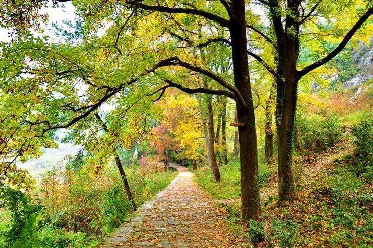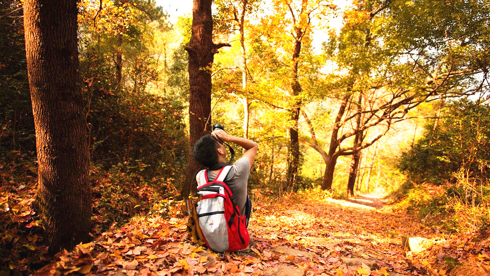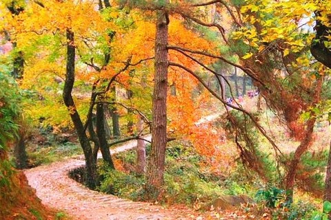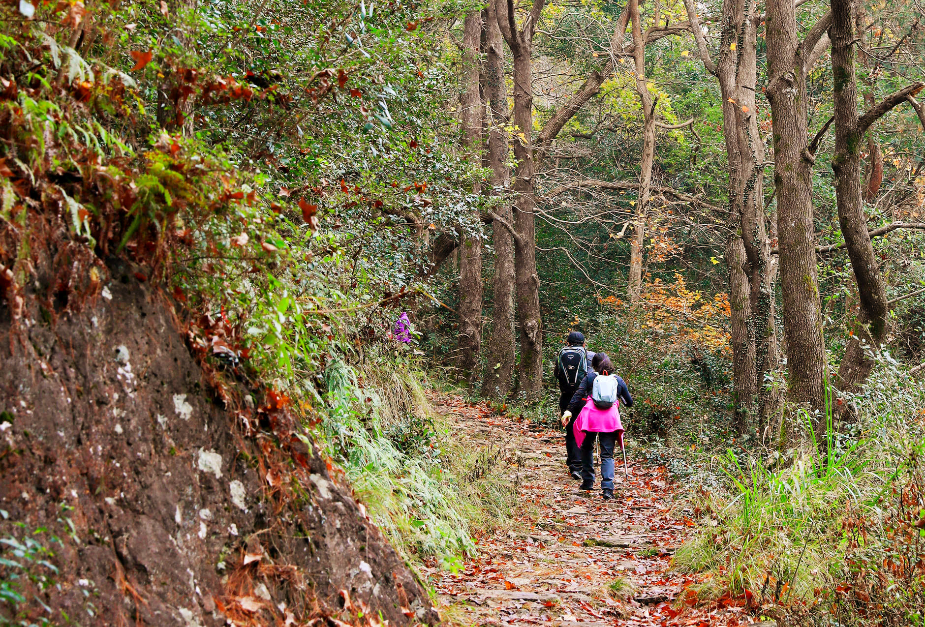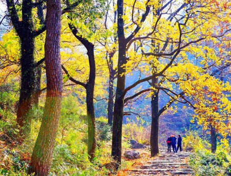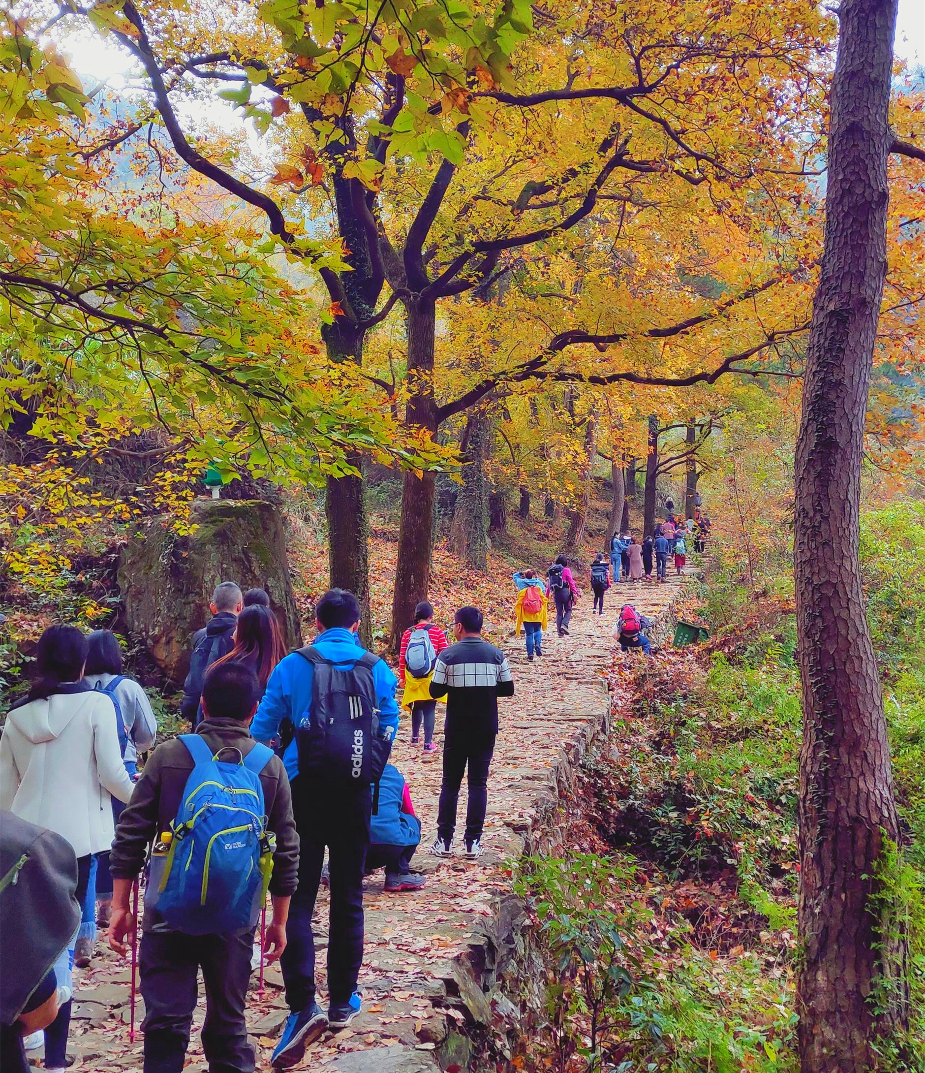 是天台和临海古时的通商要道,虽然没有徽杭古道那样的有名,但其一边是沧桑古道,高大枫树罗列两边,仿佛油画一般;另一边是无穷无尽的梯田,夹杂着古老梯田;春天花开,梯田放水的时候,尤其漂亮。此线路强度难度不大,适合所有年龄层。“北有香山红叶,南有南黄古道”,由于受网友、驴友的热捧,南黄古道被大家列为全国八大赏枫基地之一。在古时,南黄古道的美景被称为“南山秋色”。为乾隆御赐的“天台八景 ”之一。南屏乡位于天台县南边,传统上称为南山。南山多野生红枫与乌桕树,每到深秋树叶火红一片,与雪白的桕子相映成趣。