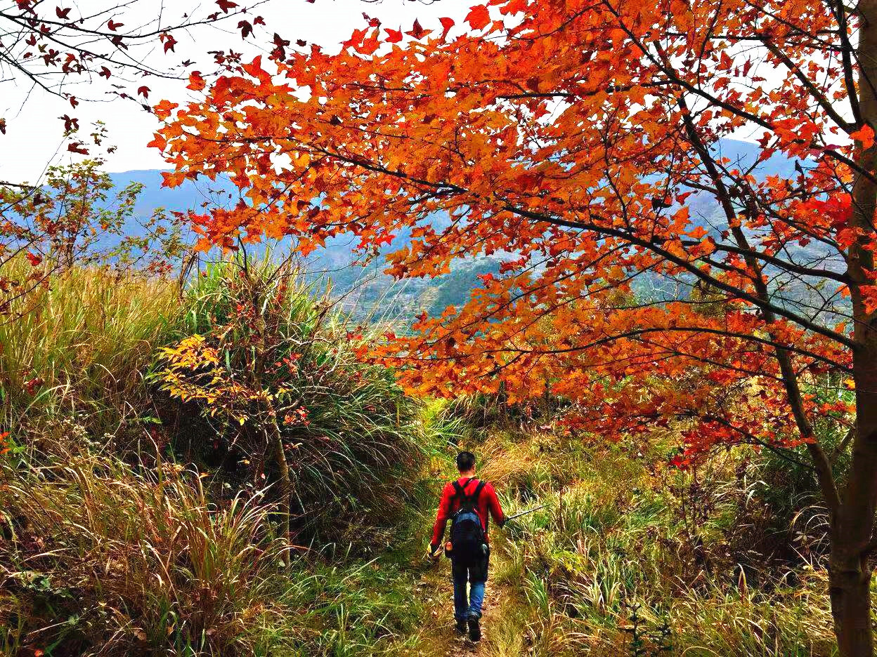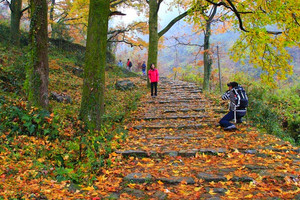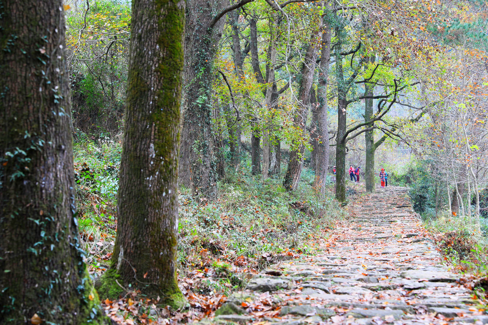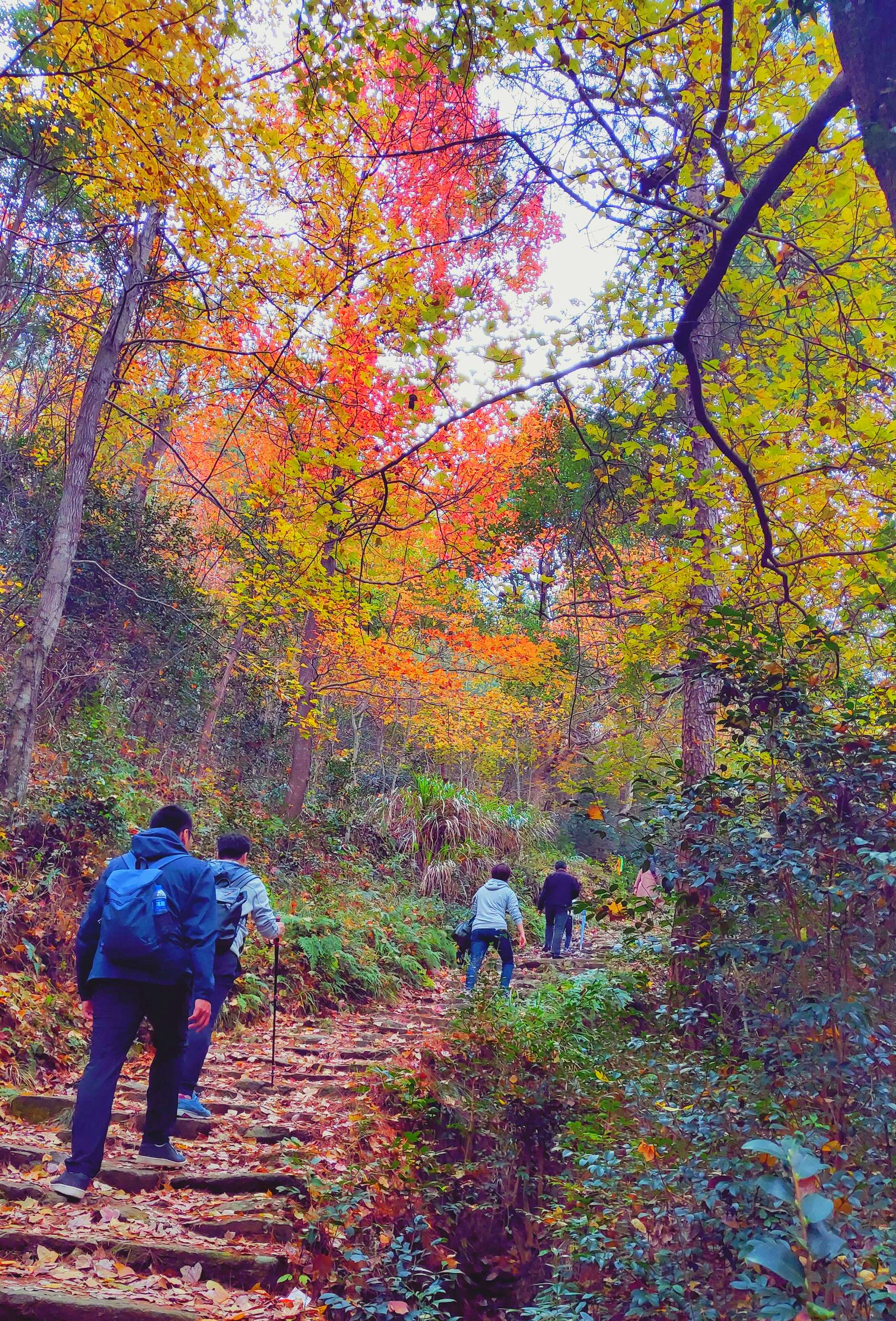 11:30左右到达南黄古道的起点。这是一个千年古村,村中古树很多,几百年的古樟树随处可见! 穿过村子,沿着溪流,我们开始进入南黄古道的红枫区。古道悠悠,沿途都能看到古老的枫叶,红、黄、绿交织一起,阳光从枫叶中透射下来,别有一番滋味。石板路上也早已是落叶缤纷,踩上去软软的沙沙的,声音清脆悦耳。。 一路踩着古老而斑驳的台阶古道而上,终于来到了外庵(济公庙)。天台县是济公的故乡,济公庙虽然已经破败不堪,也能窥见当地百姓受济公的影响之深。
