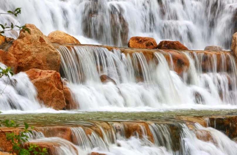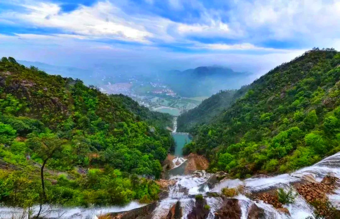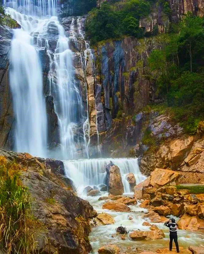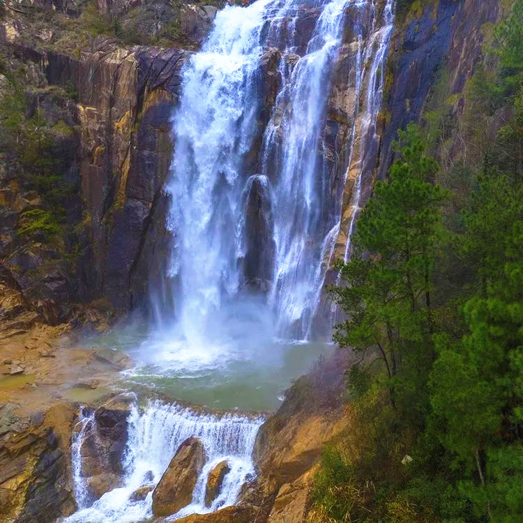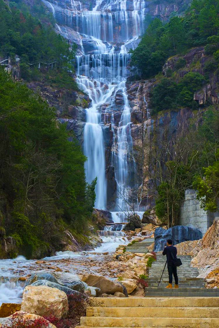 天台山大瀑布景区位于台州天台境内的桐柏山西麓,主体大瀑布总落差 325 米,最大宽度90米,是个罕见的高落差亲水梯级瀑布群,堪称中华第一高瀑。从上到下依次有龙游三井、群蛟争壑、阆苑仙葩、悬瀑风雷、幽谷叠瀑大大小小8个瀑布群。