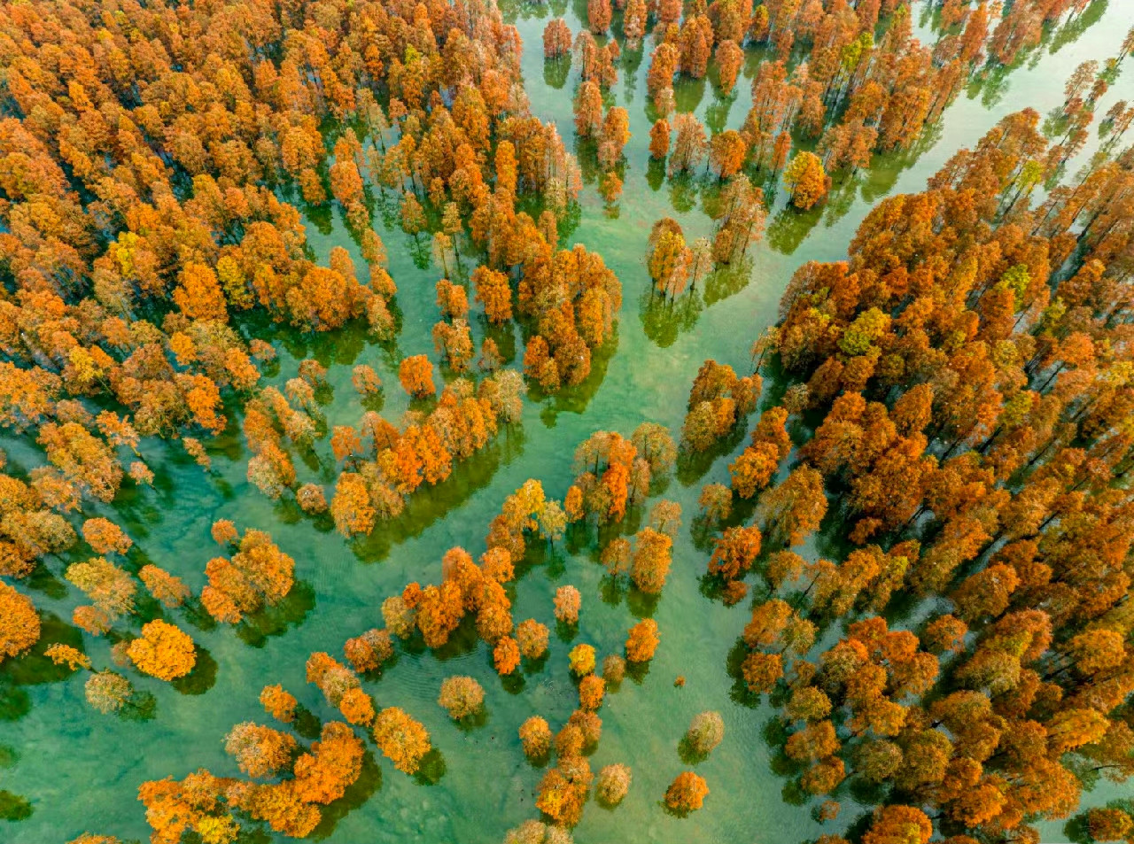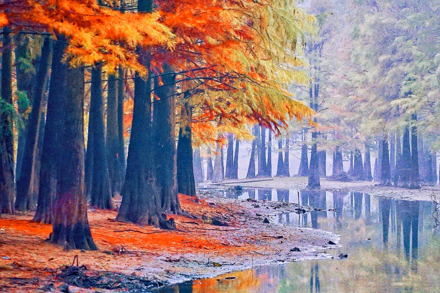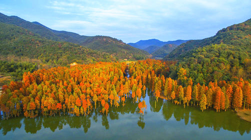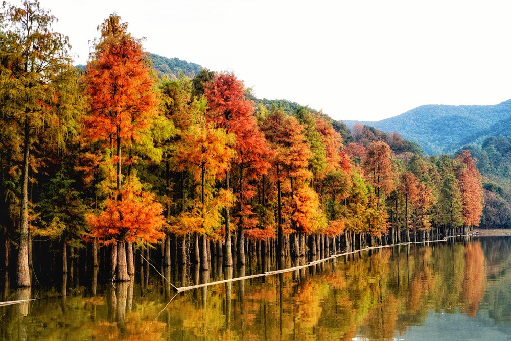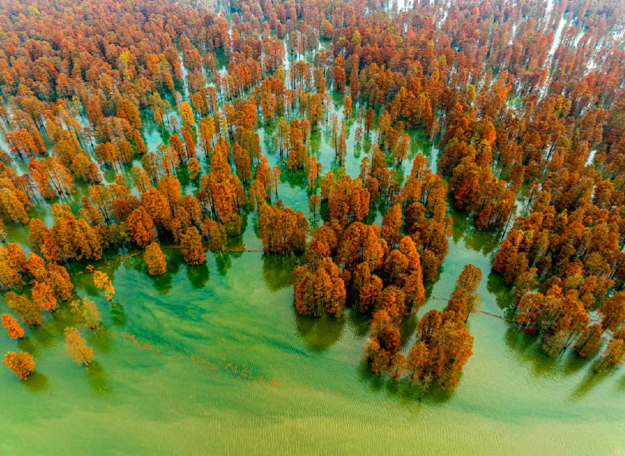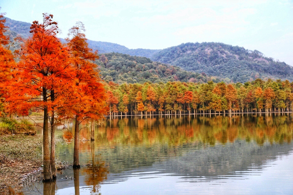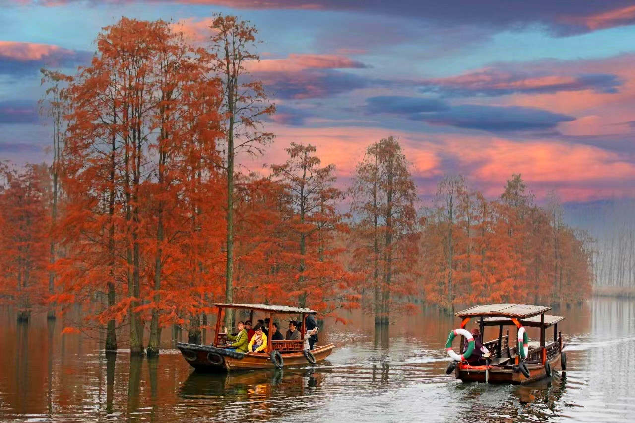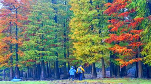 夏季成为白鹭等鹭鸟的栖息繁殖地,到了秋冬季节,随着水杉、池杉变色,一方美景自然天成。虽然都有一个“杉”字,但水杉和池杉色彩上有所差异。水杉秋色叶色彩相对较暗淡,池杉色彩则相对明快。湖中水杉成林,湖面空旷,暖光漏过水杉点点鳞光,夕阳之美,让人惊艳。踩着枯黄的落叶,漫步在橙黄色的林道间,一步一景,都是古典油画般的绝美景色。走近看时,水杉或红,或黄,或红中带黄,黄中有红,绚丽多彩,让人目不暇接。“只言春色能娇物,不道秋霜更媚人”,这句诗用在此时此地是最恰当不过了。