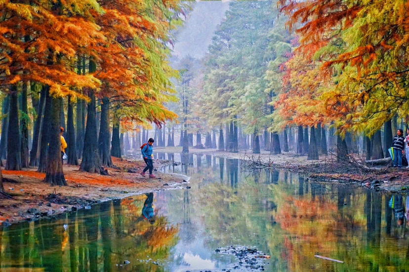 终点抵达【池杉湖】,这里池杉成林,百鸟飞翔其中,大片的水杉在秋天显得尤为幽静撩人。穿梭在树林中,脚踩着松软的腐植落叶,拥抱着高大而笔直的杉树,抬眼看一树金黄与火红,呼吸着新鲜清新的空气,把秋日里一切的美好都寄托在这里。