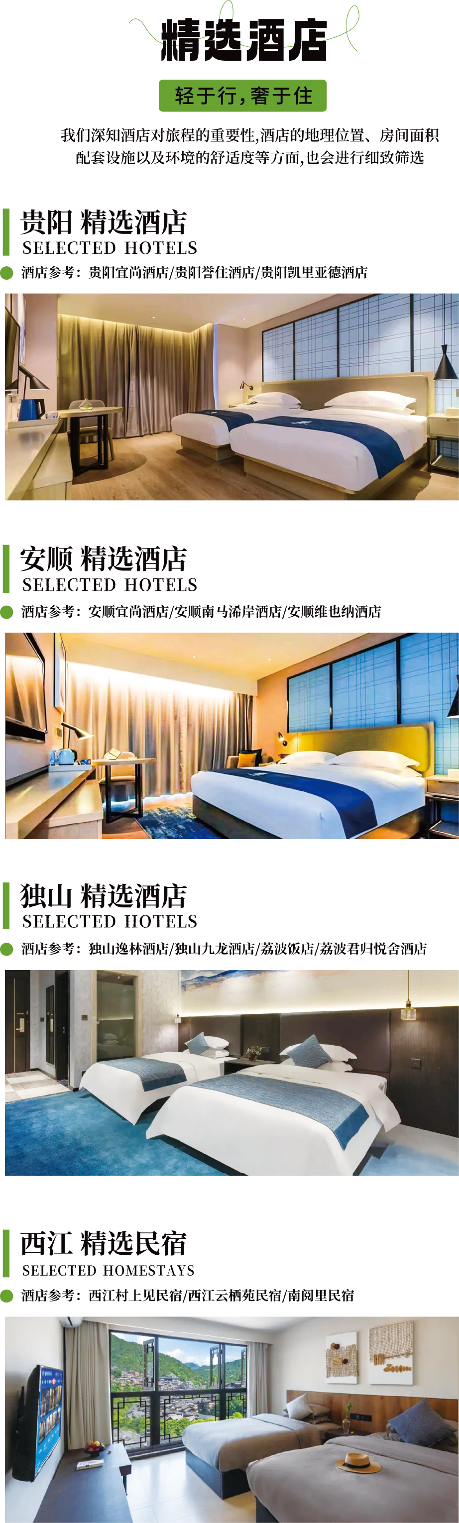 其他:费用包含所未提及的任何形式消费(如:黄果树景区扶梯索道、小七孔鸳鸯湖划船、西江苗寨商业演出、青岩古镇景交车以及古镇内小景点等可自由选择消费项目)