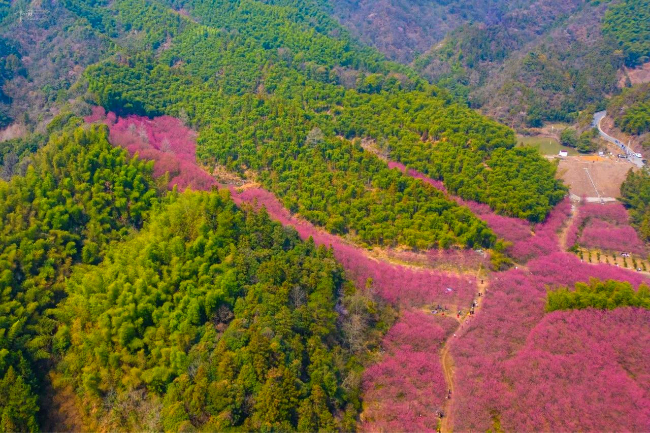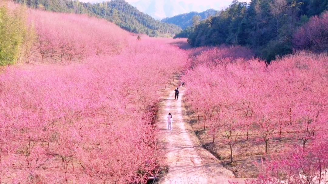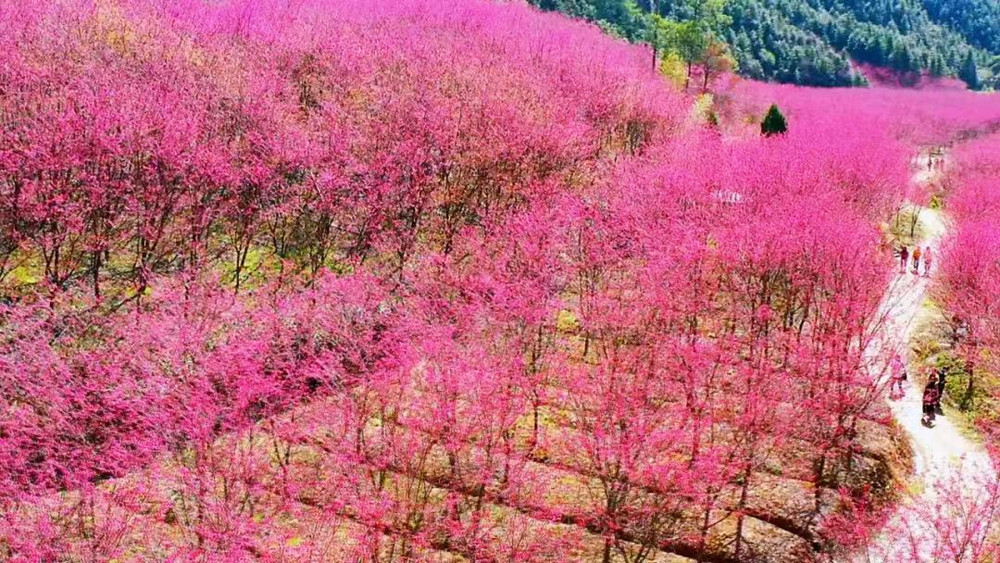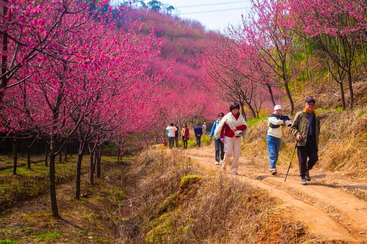 米积村米积山脚下,十万多株樱花竞相开放。这种樱花树叫“中国红”,因花色绯红,花姿出众而得名。樱花分为集中种植的600亩和山间小路的400余亩。它比普通樱花开花早、花期长,整株树的花期约15天左右。平时我们看见的大多是粉色樱花,这样的红色樱花也别有风情哦。我们在樱海穿梭,零距离亲密接触将米积樱花,随后沿着种满樱花的小道登顶米积山。米积山最高海拔407米,神奇的是,虽然海拔不高,但因周围均是丘陵平原,雨水稍一多,山上便会出现云雾景观。