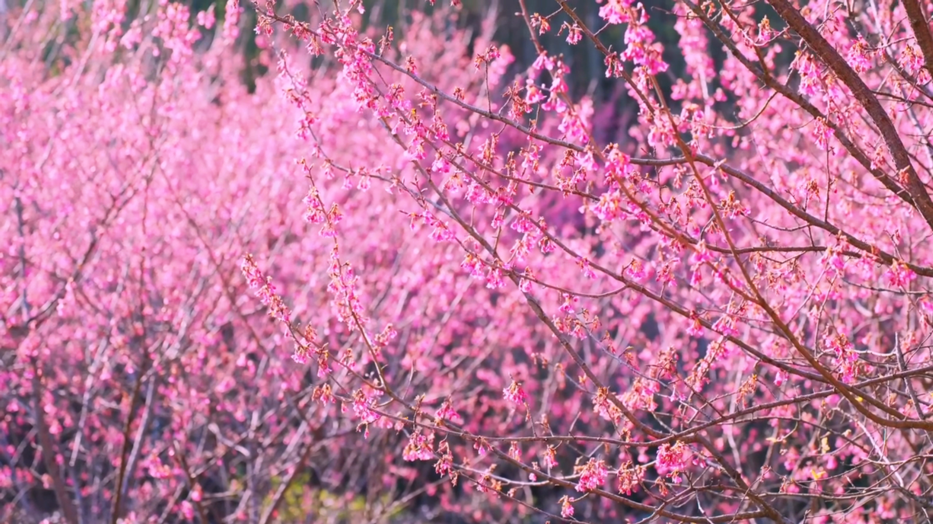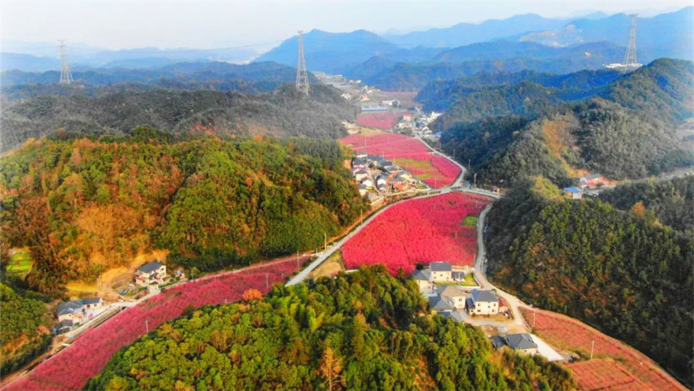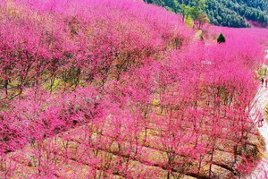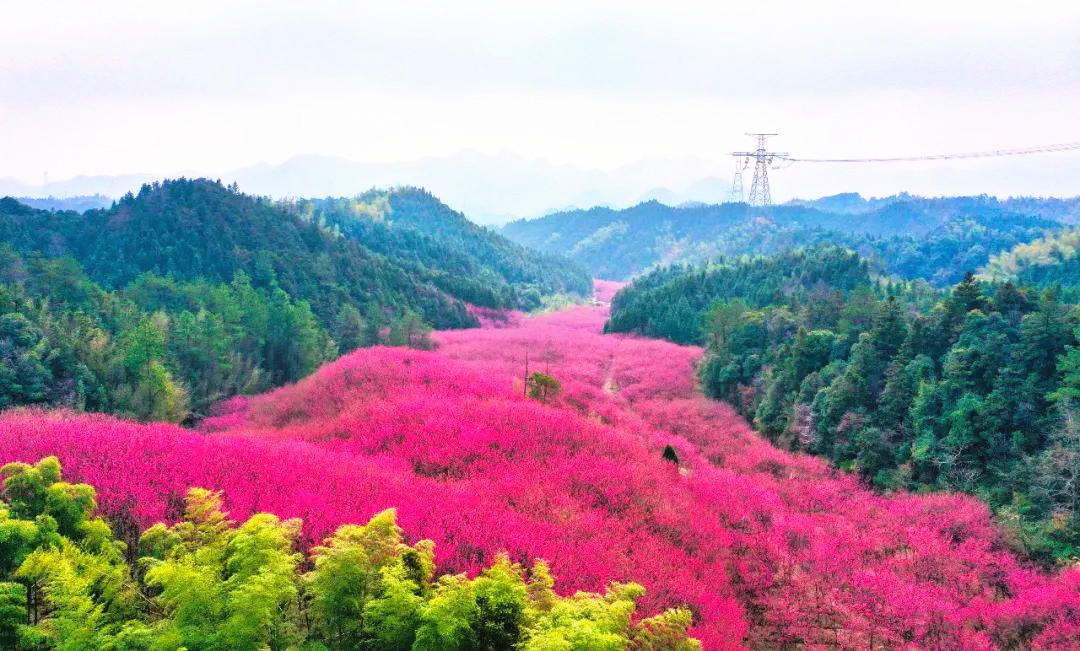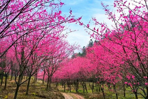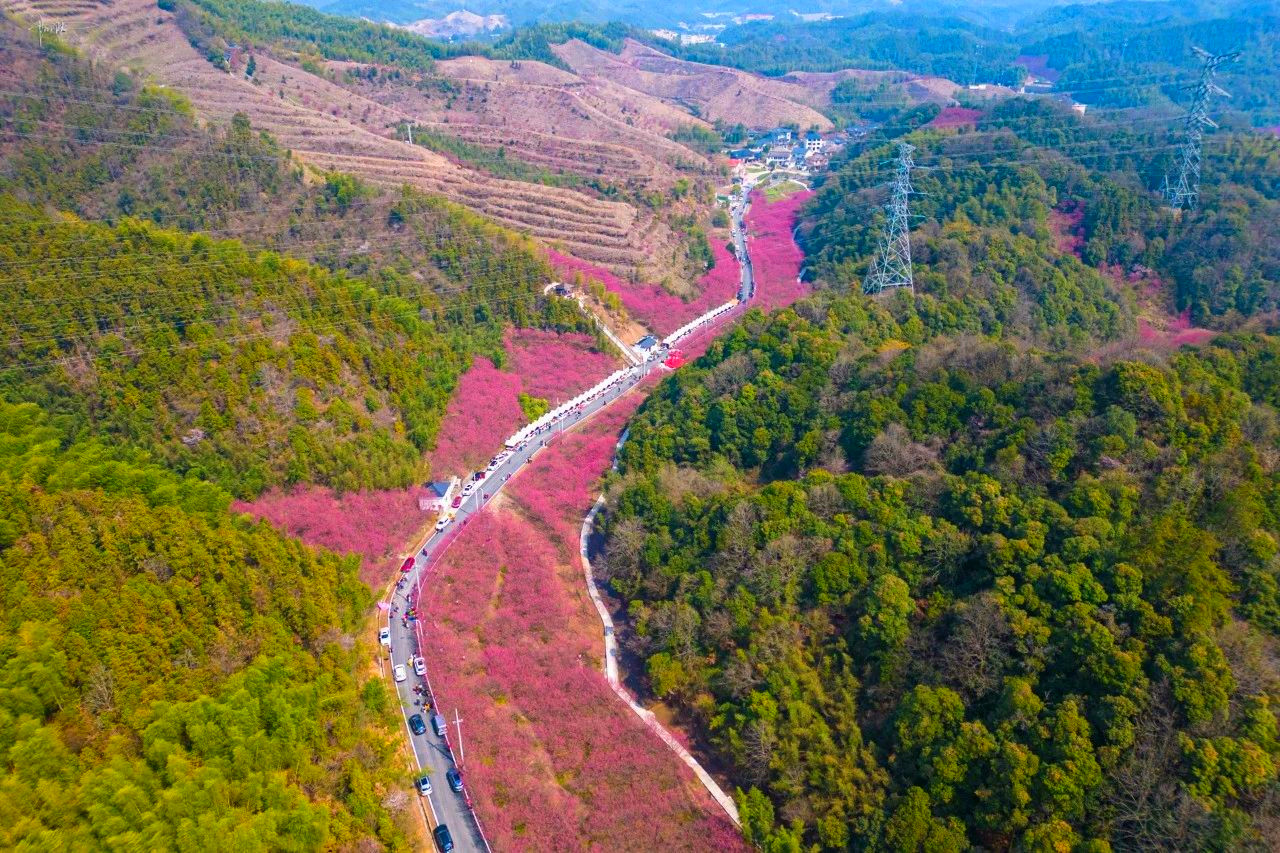 米积村米积山脚下,十万多株樱花竞相开放。这种樱花树叫“中国红”,因花色绯红,花姿出众而得名。樱花分为集中种植的600亩和山间小路的400余亩。它比普通樱花开花早、花期长,整株树的花期约15天左右。平时我们看见的大多是粉色樱花,这样的红色樱花也别有风情哦。我们在樱海穿梭,零距离亲密接触将米积樱花,随后沿着种满樱花的小道登顶米积山。米积山最高海拔407米,神奇的是,虽然海拔不高,但因周围均是丘陵平原,雨水稍一多,山上便会出现云雾景观。