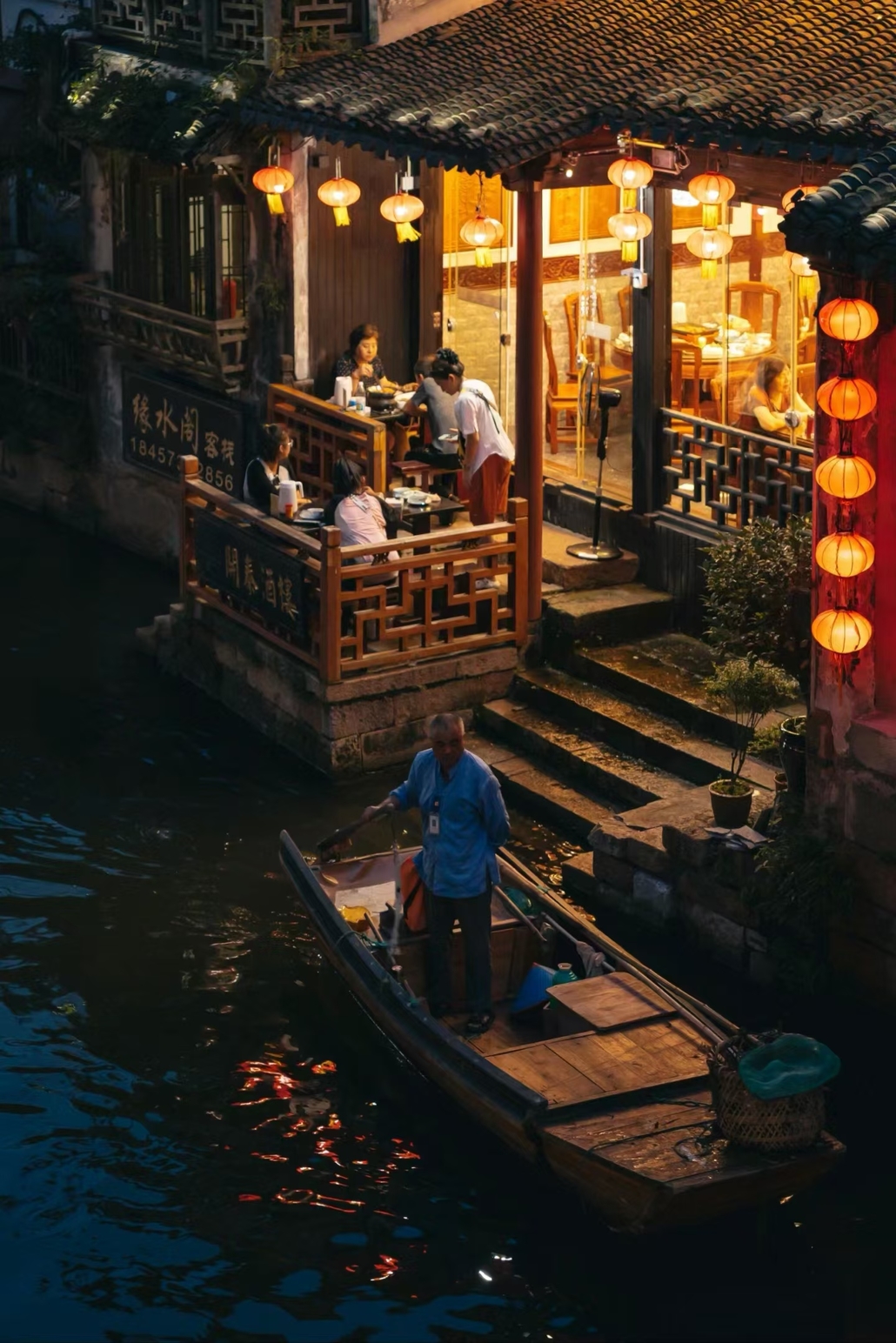19:00左右,夜幕降临,华灯初上,一盏盏红灯笼亮起来,一艘艘小船儿摇起来,一群群游人们欢起来,或是选择步入一家具有西塘特色的小店独处一下。无论如何,定格住此刻美好的画面吧!
