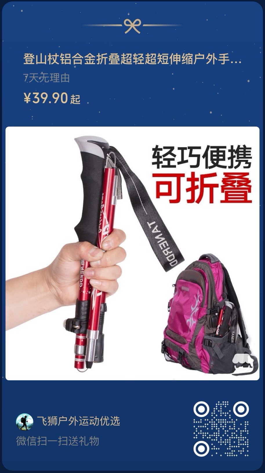 【选带】登山杖,手套,护膝,头灯,手台,太阳镜,少量现金,自备药品如晕车药,邦迪等,充电宝,纸巾,防蚊花露水/风油精,防晒霜,垃圾袋等