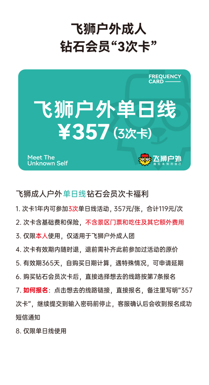 飞狮户外成人单日线次卡357元(共3次),合计每次119元